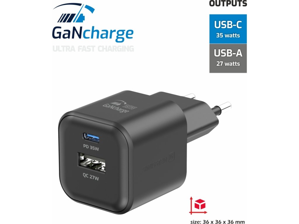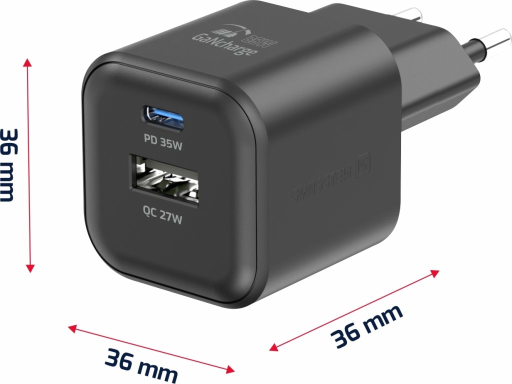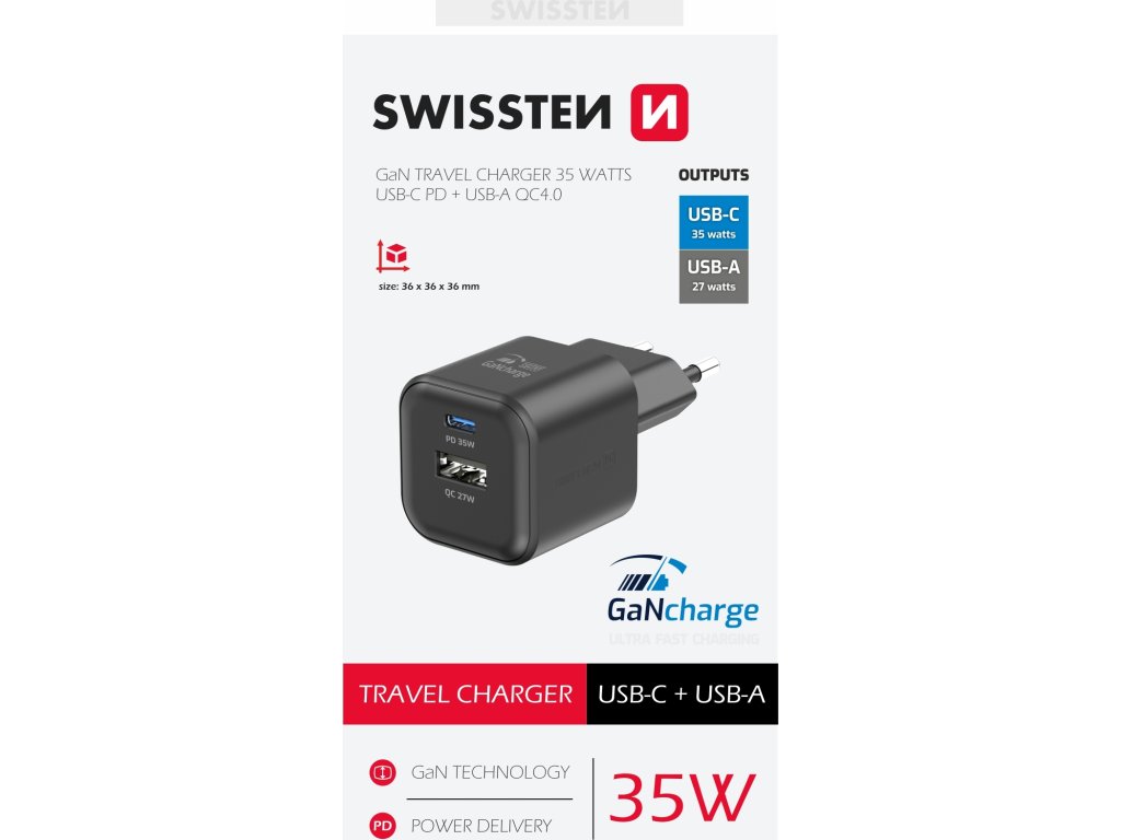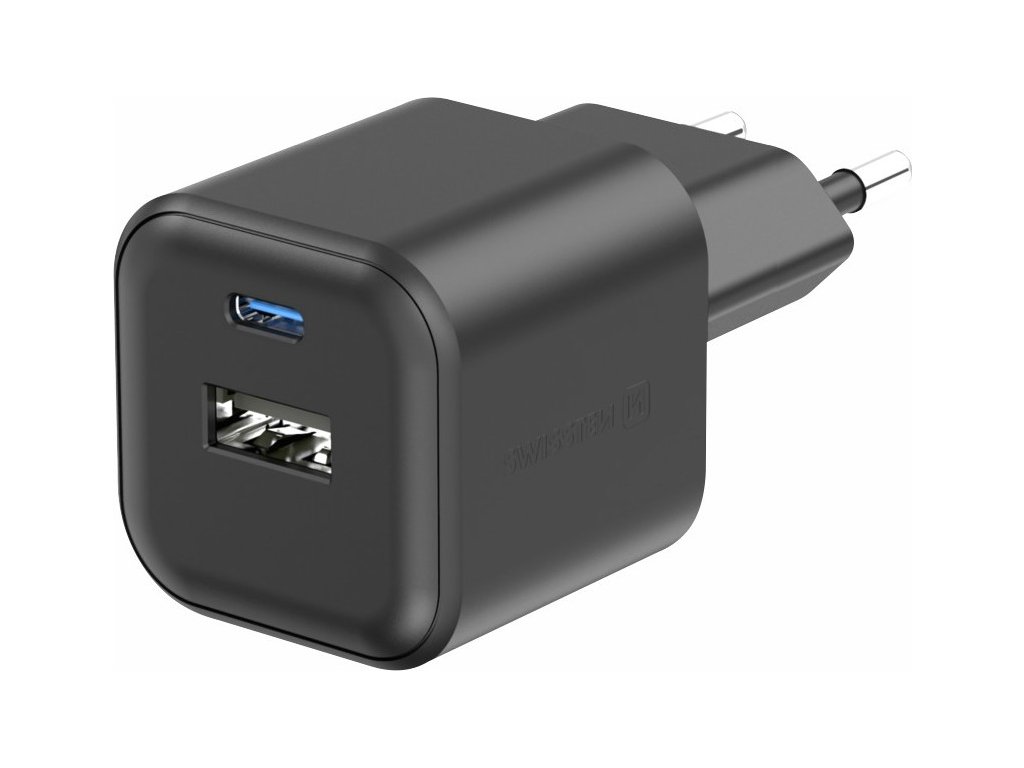 SWISSTEN SIEŤOVÝ ADAPTÉR GaN 1x USB-C 35W PD + 1x USB-A 27W QC ČIERNY