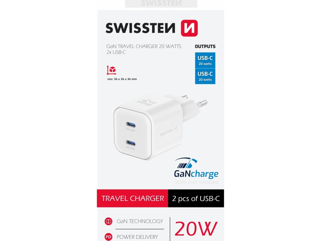 SWISSTEN SIEŤOVÝ ADAPTÉR GaN 2x USB-C 20W POWER DELIVERY BIELÝ