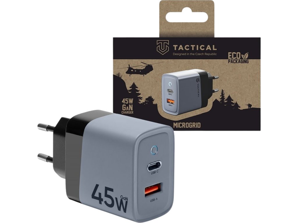 Dobi noťas, tablet alebo telefón. S Tactical Microgrid GaN 45W už druhú nabíjačku potrebovať nebudeš. Gallium Nitride, GaN technológia Technológia, ktorá poskytuje vysoký výkon a zároveň umožňuje zachovať veľmi kompaktné rozmery nabíjačky. Oproti ostatným nabíjačkám má výhodu vo vyššej účinnosti, menších rozmeroch a dlhšej životnosti. 45W Celkový výkon nabíjačky 45W Ti zaručí, že môžeš nabíjať svoj MacBook Air, iPad alebo ostatné notebooky a tablety s podporou tohto nabíjania. Výkon 45W nie je zdieľaný. To znamená, že na jeden USB-C port utiahneš skutočne celých 45W a neudáva iba súčet všetkých portov. Nabíjačka celkom disponuje dvoma portami: 1xUSB-C a 1xUSB-A port. Rýchlonabíjacie štandardy Tactical Microgrid je majster v univerzálnosti. Podporuje celú škálu rýchlonabíjacích štandardov. Od PPS cez PD3.0, QC3.0, Samsung, AFC, Huawei, BC1.2 až po Apple. Originálny štýl Tactical Starostlivo vybrané farby a štýl sa odlišuje od ostatných a zároveň dopĺňa tvoj jedinečný štýl. Vyber si z dvoch farieb. Nevšedná žltá alebo kruto šedá. NEODOLATEĽNE ODOLNÝ Tento kúsok nie je len pre parádu. U nás v Tactical dbáme na to, aby veci niečo vydržali. Tactical Microgrid bol podrobený tvrdým podmienkam a pri výrobe sme použili veľmi odolné materiály a aplikovali najnovšie technológie pre čo najlepší výstup kvality. BE ECO My v Tactical máme radi prírodu. Všetky naše produkty sú balené do ECO škatuliek z recyklovaného papiera tak, aby čo najmenej zaťažovali životné prostredie. Mysli takticky!