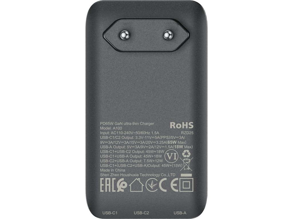 - USB-C1/C2: PPS, napájanie 2.0/3.0, rýchle nabíjanie 4+/3.0/2.0, AFC, FCP, SCP, DCP 1.5A, iP 2.4A