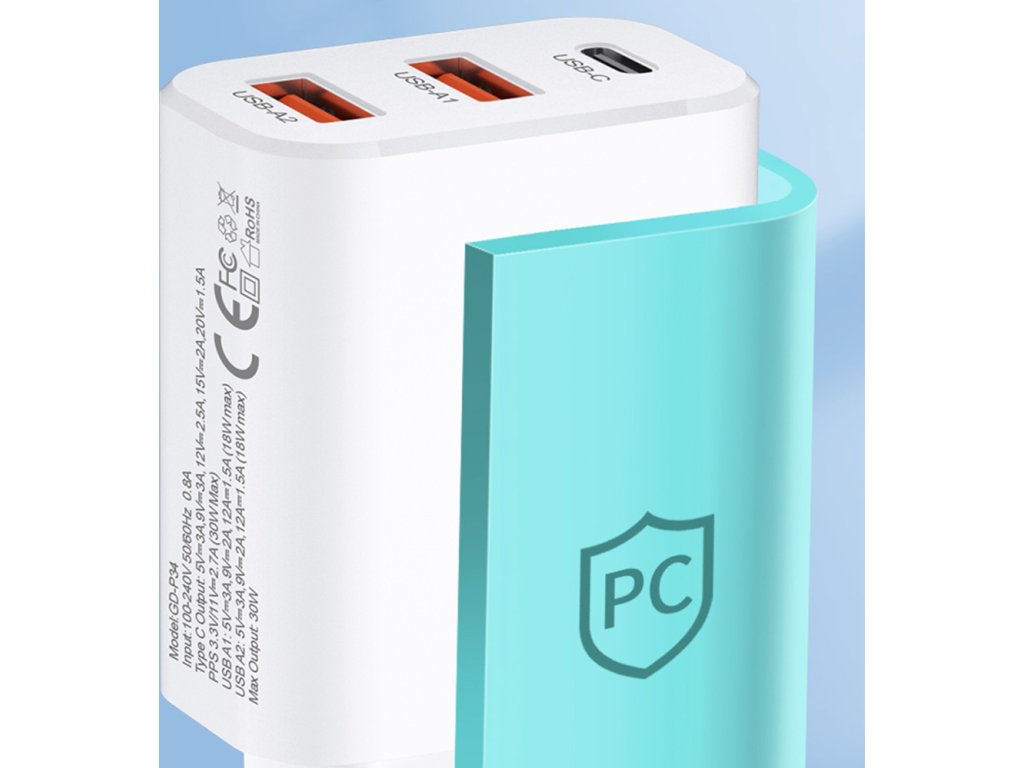 - Umožňuje nabíjať viacero zariadení súčasne. Nabíjačka má jeden USB-C a dva USB-A výstupy.
