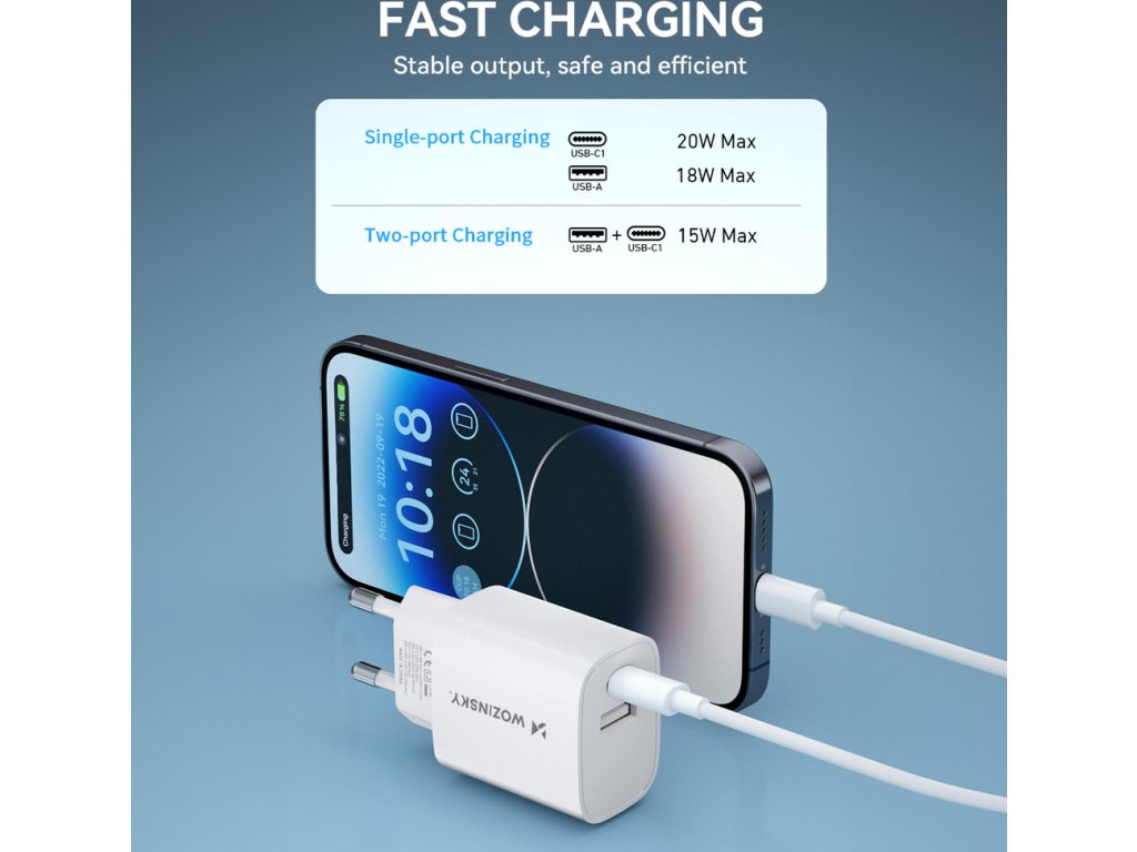Nabíjačka Wozinsky WGWCW je vybavená portami USB-C a USB-A, ktoré ponúkajú rýchle nabíjanie s výkonom až 20 W, respektíve 18 W. Pri súčasnom použití oboch portov je nabíjací výkon 15 W, čo je ideálne na súčasné nabíjanie telefónu a tabletu.