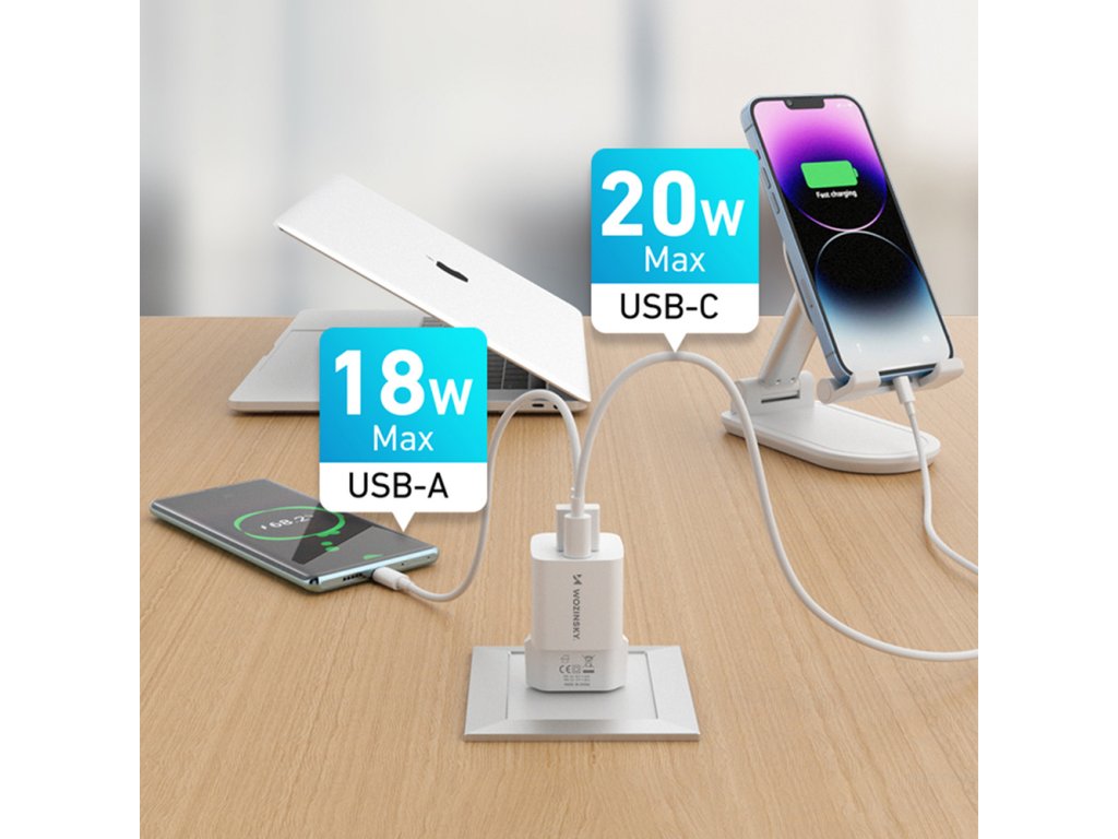 Nabíjačka Wozinsky WWCEAC je vybavená dvoma typmi portov: USB-A a USB-C. Môžete nabíjať dve rôzne zariadenia súčasne.
