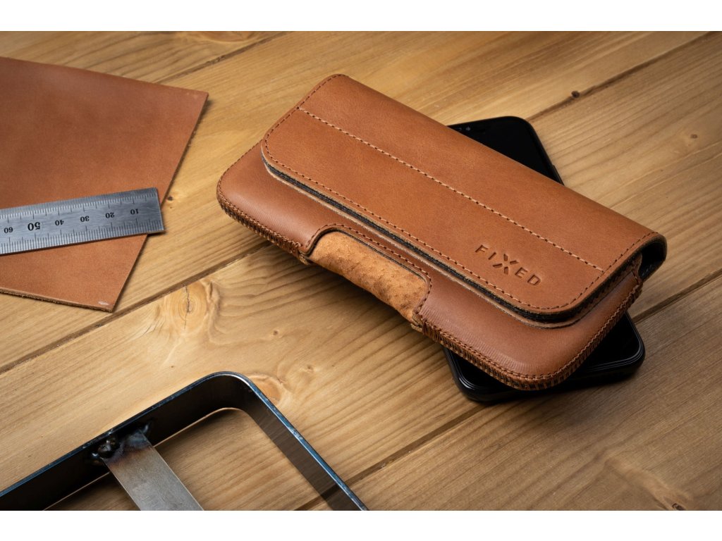 Ručne šité univerzálne puzdro z pravej hovädzej kože FIXED Posh predstavuje elegantný a originálny doplnok pre váš mobilný telefón. Vďaka termoplastickému tvarovaniu drží vystužený tvar a poskytne tak plnú ochranu pre vložený telefón. Puzdro je určené na nosenie na opasku, kovový klip na zadnej strane ľahko pripnete aj odopnete k pásku do šírky 4 cm. Jednoduché vybratie telefónu je zaistené pomocou vytlačovacieho systému v spodnej časti puzdra, zatváranie je istené kvalitnými magnetmi.