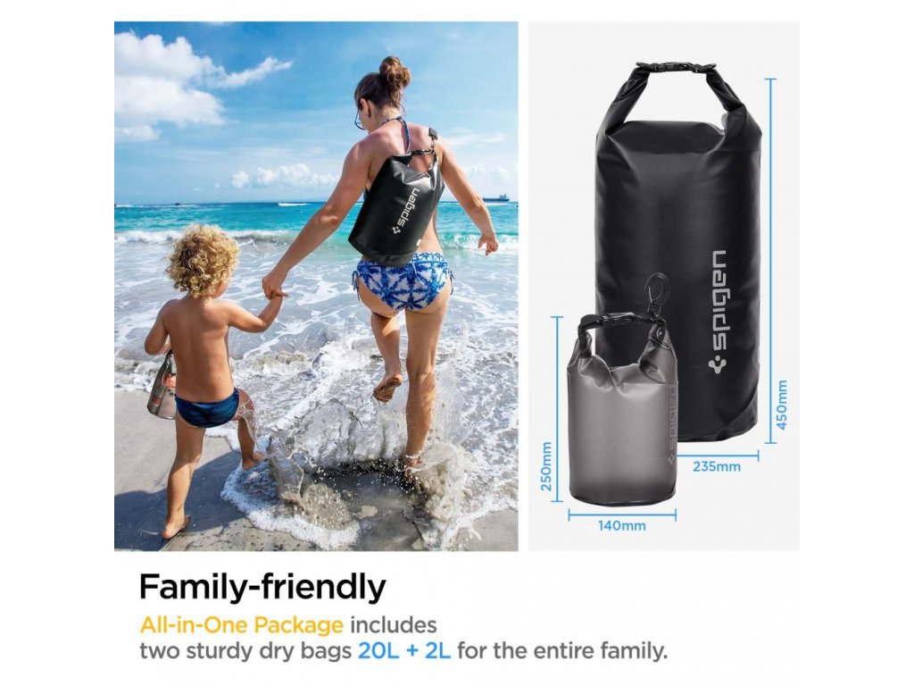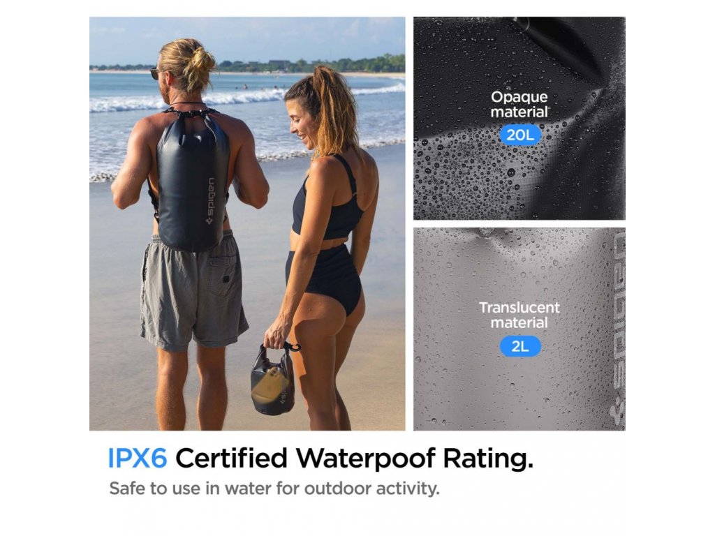 Funkčná sada dvoch vodeodolných vakov (20L a 2L) A630 od Spigen. Vďaka ľahkej a vodeodolnej konštrukcii sú ideálne na prevádzkovanie vodných športov, turistiku alebo kempovanie. Dvojitý uzamykací systém zaisťuje, že predmety ponechané vo vnútri zostanú chránené pred účinkami zaplavenia.