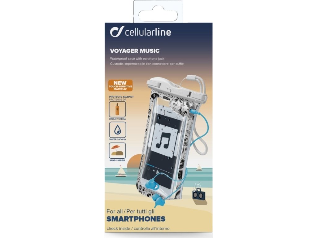 Puzdro CellularLine Voyager Music je ideálny spoločník na dovolenku na pláži, bezpečne ochráni váš telefón pred vodou, pieskom aj opaľovacím krémom. Vďaka vodeodolnému 3,5 mm konektoru môžete do telefónu v puzdre bez obáv pripojiť slúchadlá a užívať si vašu obľúbenú hudbu. Voyager Music je univerzálne púzdro vhodné pre telefóny do veľkosti 8 x 15,5 cm. Priehľadná predná časť puzdra vďaka svojej citlivosti umožní ovládanie dotykového displeja, vrátane pokročilých funkcií ako je Force Touch, 3D Touch a Touch ID. Pre bezpečné držanie v ruke pri vodných radovánkach je puzdro opatrené elastickým pútkom na ruku v zadnej časti a pre istotu šnúrkou na zápästie. Môže sa pochváliť stupňom krytia IPX8, takže s ním nemusíte zostávať na pláži, ale môžete ho vziať aj do vody do hĺbky až 20 metrov. Užite si leto naplno a bez obáv o váš smartfón s puzdrom Voyager.