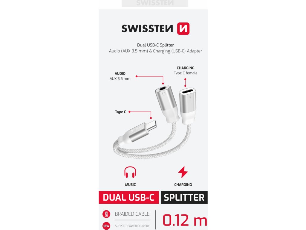NABÍJACÍ AUDIO ADAPTÉR SWISSTEN TEXTILE USB-C (samec) / USB-C (samica) a 3,5mm AUX 0,12 M BIELÝ