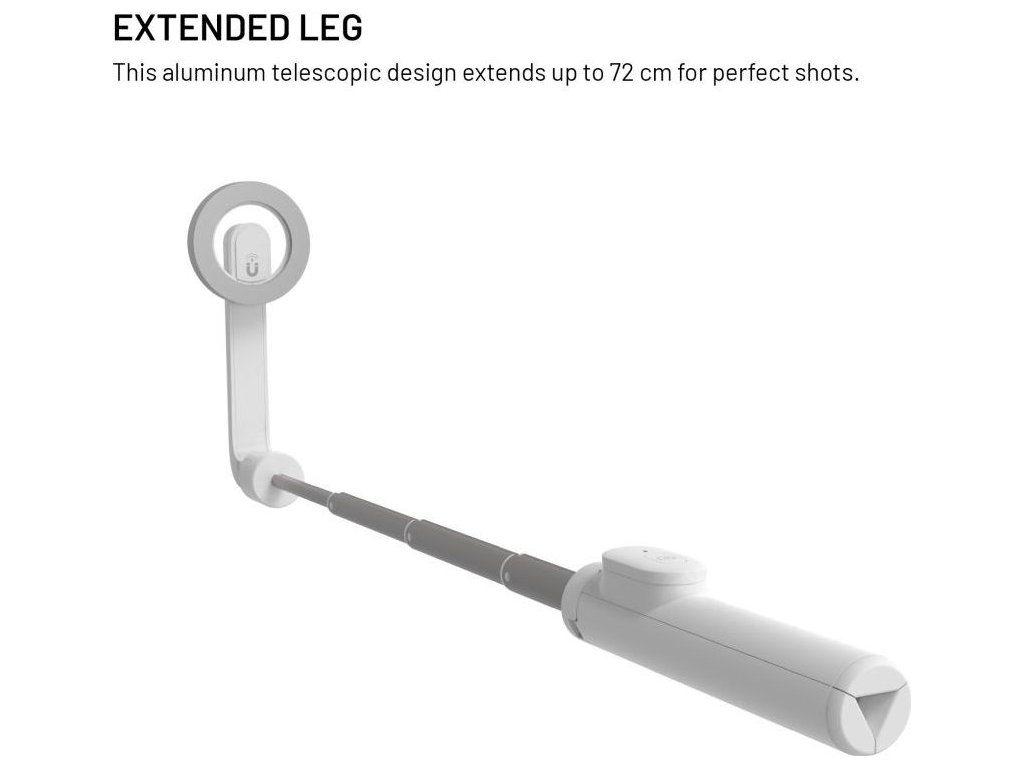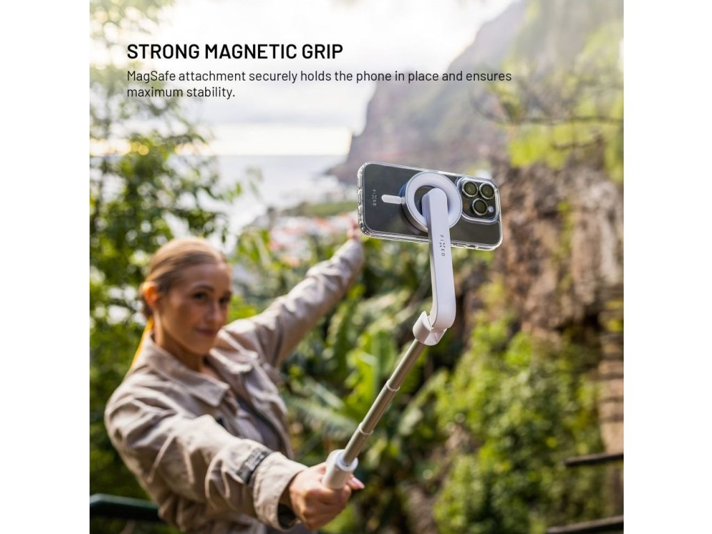 Teleskopická selfie tyč FIXED MagSnap s tripodom a odnímateľnou spúšťa je praktickým pomocníkom pre fotenie a natáčanie videí prostredníctvom vášho iPhone s MagSafe funkciou. MagSnap selfie tyč je vyrobená z odolnej hliníkovej zliatiny s možnosťou vytiahnutia piatich častí teleskopického ramena, ktoré po kompletnom rozložení dosahuje dĺžku až 72 cm. Na uchytenie telefónu sa nevyužíva klasických klieští, ale plochy so silnými MagSafe magnetmi, ktoré bezpečne udržia telefón v každej pozícii aj pri prudkých pohyboch. Selfie tyč sa môže jednoduchým rozložením rukoväte premeniť na stabilný tripod, ktorý budete môcť ovládať vďaka odnímateľnej spúšti s vymeniteľnou batériou a dosahom až 10 m. MagSnap tyč vezmite všade so sebou, po zložení má iba 17 cm, takže sa zmestí do každej kabelky či batohu a je vždy pripravená na vytváranie skvelých spomienok s vašou rodinou a priateľmi.