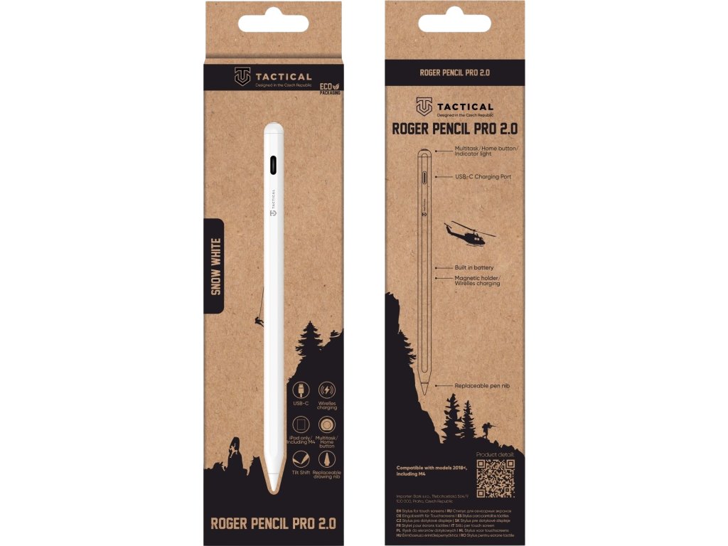 Posaď sa do pokoja a nacvakni si Tactical Roger Pencil Pro 2.0 na iPad. Či už si umelec, stratég alebo digitálny bojovník, táto unikátna ceruzka na iPad je pripravená okamžite na akciu. A to buď v klasickej čiernej alebo krištáľovo bielej. Magnetická sila Pricvakni Roger Pencil Pro 2.0 na iPad, ako by bol jeho súčasťou. Tactical Roger Pencil Pro 2.0 je vybavený magnetickou funkciou, ktorá zaisťuje okamžitú pripravenosť, keď povinnosť volá. Bezdrôtová munícia Dopraj mu šťavu priamo z iPadu alebo z bezdrôtovej nabíjacej podložky. Si priaznivcom old-school? Bez obáv - nabi priamo zo zásuvky pomocou USB-C portu a kábla v balení. Rýchle pripojenie Žiadne zdržanie sa netoleruje. Tactical Roger Pencil Pro 2.0 disponuje rýchlou synchronizáciou av okamihu ťa informuje o stave batérie priamo v statusovom riadku iPadu. Majstrovstvá Palm Rejection Tactical Roger Pencil Pro 2.0 sa pýšia najnovšou technológiou palm rejection. Tvoja dlaň tak môže byť bez obáv opretá o displej, zatiaľ čo kreslíš alebo plánuješ stratégiu. Taktické horné tlačidlo Prevezmi kontrolu nad svojím iPadom. Zapni/vypni ceruzku podržaním tlačidla, vráť sa na domovskú obrazovku iPadu alebo aktivuj multitasking. Vstavané LED svetlo v tlačidle Ťa informuje o stave batérie alebo nabíjania. Základ z medi Tactical Roger Pencil Pro 2.0 v sebe skrýva silu v podobe kostry vyrobenej z vysoko kvalitnej vodivej medi, ktorá určuje presnosť Tvojim príkazom. NEODOLATEĽNE ODOLNÝ Tento kúsok nie je len pre parádu. U nás v Tactical dbáme na to, aby veci niečo vydržali. Tactical Roger Pencil Pro 2.0 bol podrobený tvrdým podmienkam a pri výrobe sme použili veľmi odolné materiály a aplikovali najnovšie technológie pre čo najlepší výstup. BE ECO My v Tactical máme radi prírodu. Všetky naše produkty sú balené do ECO škatuliek z recyklovaného papiera tak, aby čo najmenej zaťažovali životné prostredie. Mysli takticky!