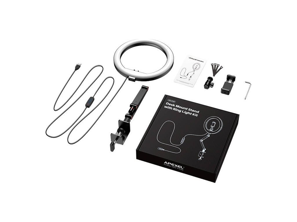 Kruhové svetlo Apexel APL-FL20 je vybavené nastaviteľnými ramenami a otáča sa o 360 °, takže si jeho polohu môžete ľahko prispôsobiť svojim individuálnym potrebám. Vďaka tomu je ideálny pre fotografovanie a natáčanie videí, rovnako ako pre kancelársku prácu alebo líčenie.