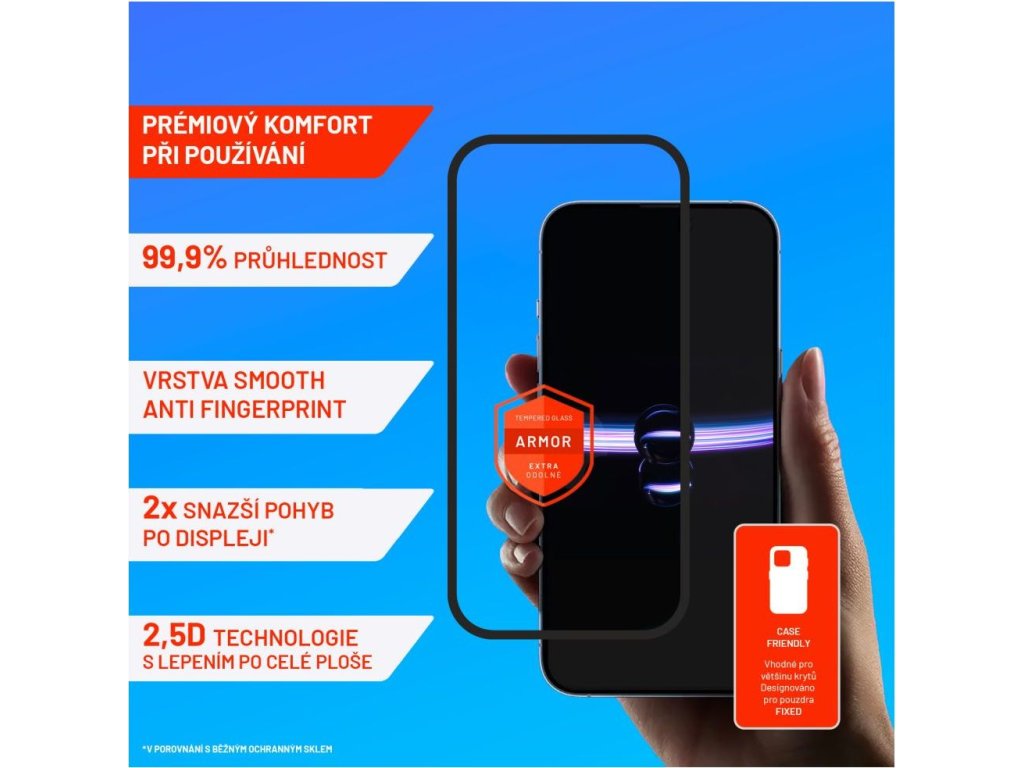Prémiové extra odolné sklo FIXED Armor perfektne ochráni displej vášho mobilného telefónu pri všetkých nástrahách bežného dňa. Určite poznáte situáciu, keď sa na novo nalepenom skle na vašom telefóne po pár dňoch objavia prvé praskliny. Klasické sklá majú totiž tendenciu pri akomkoľvek náraze ihneď praskať. Sklo Armor je oproti tomu vyrobené z extra odolného a hlavne pružného materiálu, ktorý vydrží takmer čokoľvek. Nárazy, pády aj škrabance zvládne s prehľadom a chráni tak telefón násobne dlhšie ako bežné ochranné sklo. Vonkajšiu vrstvu navyše tvorí špeciálna oleofóbna vrstva, ktorá uľahčuje pohyb prstov po displeji a zamedzuje šmuhám a odtlačkom. Vďaka použitiu prémiových materiálov vrstva drží svoje vlastnosti aj pri náročnom používaní. Pre jednoduchú a presnú inštaláciu skla nájdete v balení praktický aplikátor, ktorý uľahčí nalepenie bez zbytočných bublín na displeji. Sklo FIXED Armor je zárukou dlhodobej a bezpečnej ochrany displeja vášho smartfónu za každej situácie.