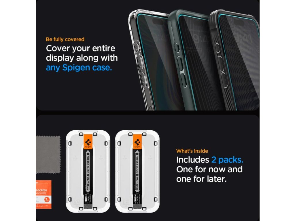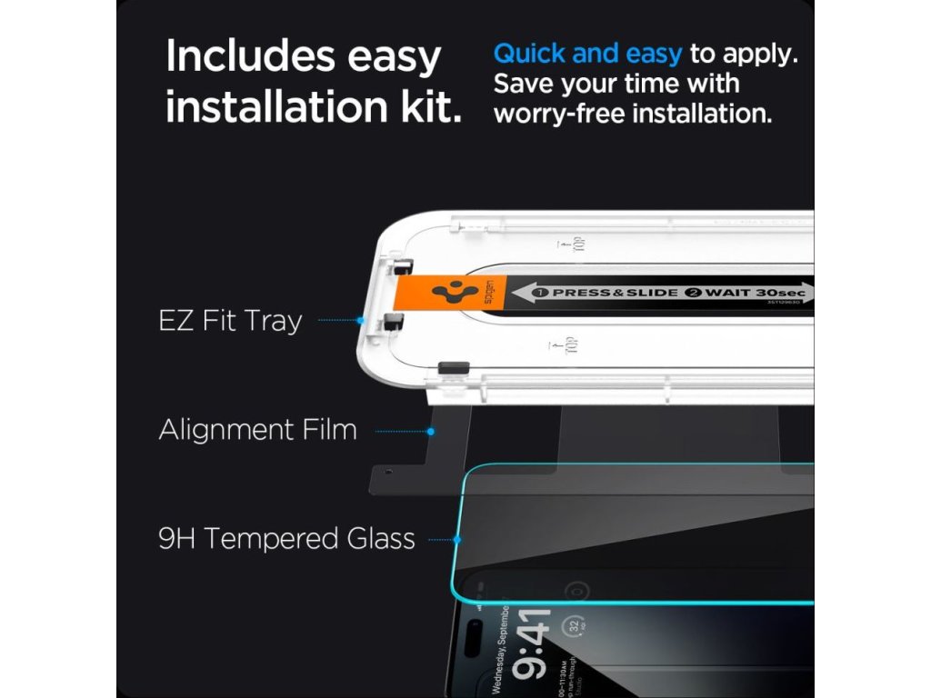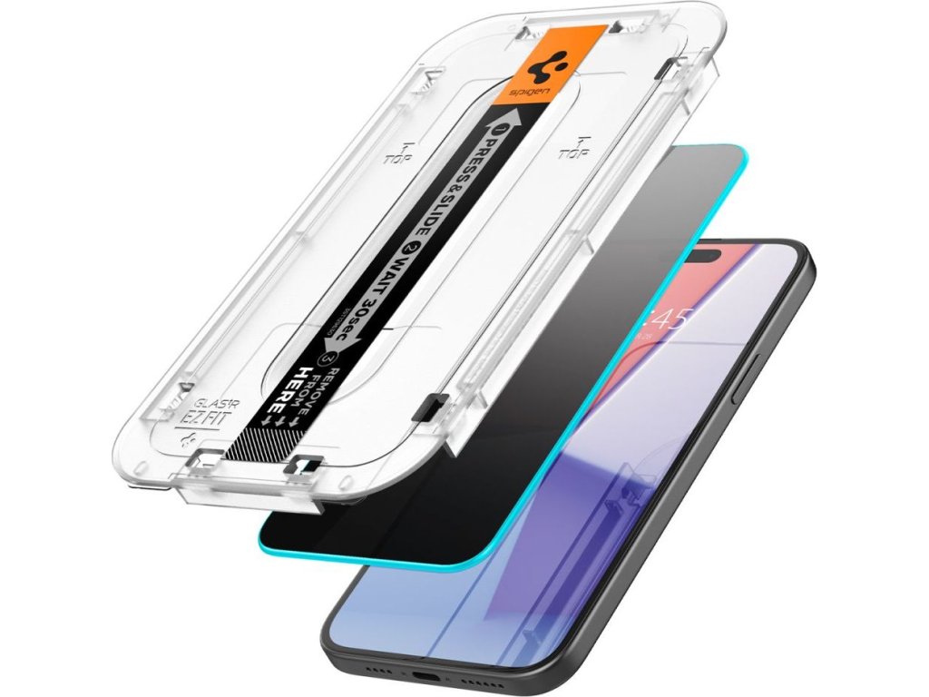 Tvrdené sklo z radu "EZ Fit" od Spigenu je chránené montážnym rámčekom dokonale vyrezaným k prednej časti telefónu, vďaka ktorému ho môžete na displeji perfektne umiestniť. Výrobca zjednodušil spôsob montáže natoľko, že je pre každého používateľa plne intuitívny.