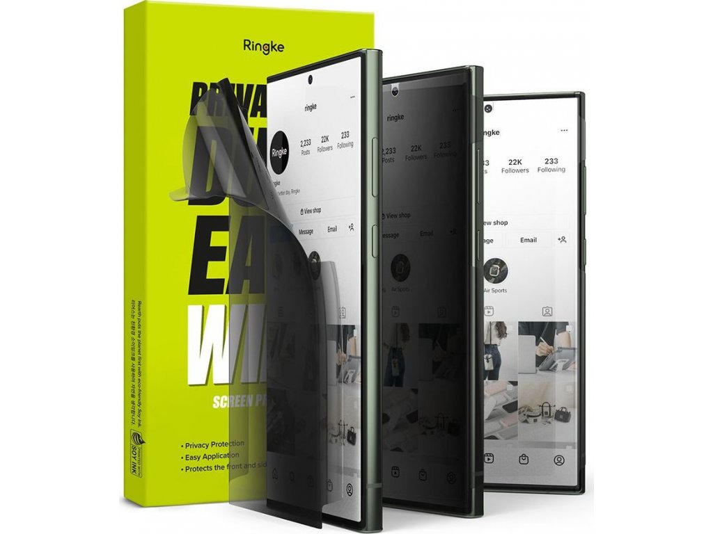 Ochranná fólia na ochranu súkromia Ringke Dual Easy ochráni celý povrch obrazovky a účinne obmedzí jej viditeľnosť pre osoby zvonku . Je vyrobená z vysoko kvalitného uretánového polykarbonátu a má odolnosť proti poškriabaniu 3H, čo účinne chráni obrazovku pred poškodením. Fólia dokonale odráža zobrazené farby a má špeciálnu antimastnú vrstvu, ktorá chráni obrazovku pred odtlačkami prstov.