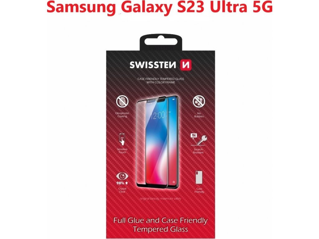 SKLO SWISSTEN PLNÉ LEPENIE, FAREBNÝ RÁM, POUZDRO SAMSUNG S918B GALAXY S23 ULTRA 5G ČERNÉ