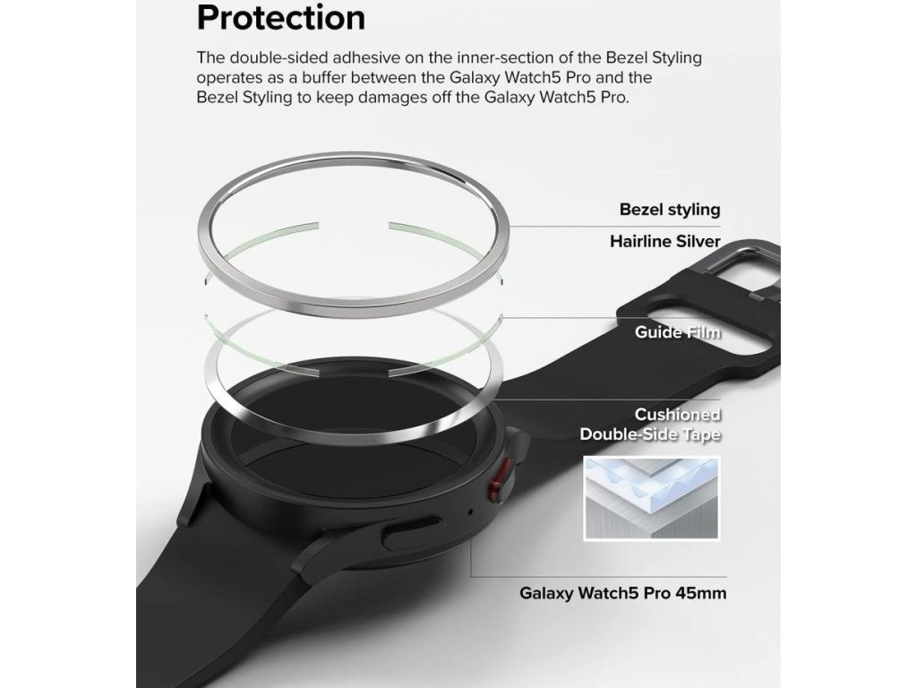 Kryt Ringke Bezel Styling poskytuje ochranu pred poškriabaním nášho zariadenia. Primerane silná, obojstranná páska vo vnútri krytu funguje ako akýsi nárazník, takže sa nemusíme báť, že by sme si hodinky poškodili. Bláznivo ľahké zostavenie a rozloženie.