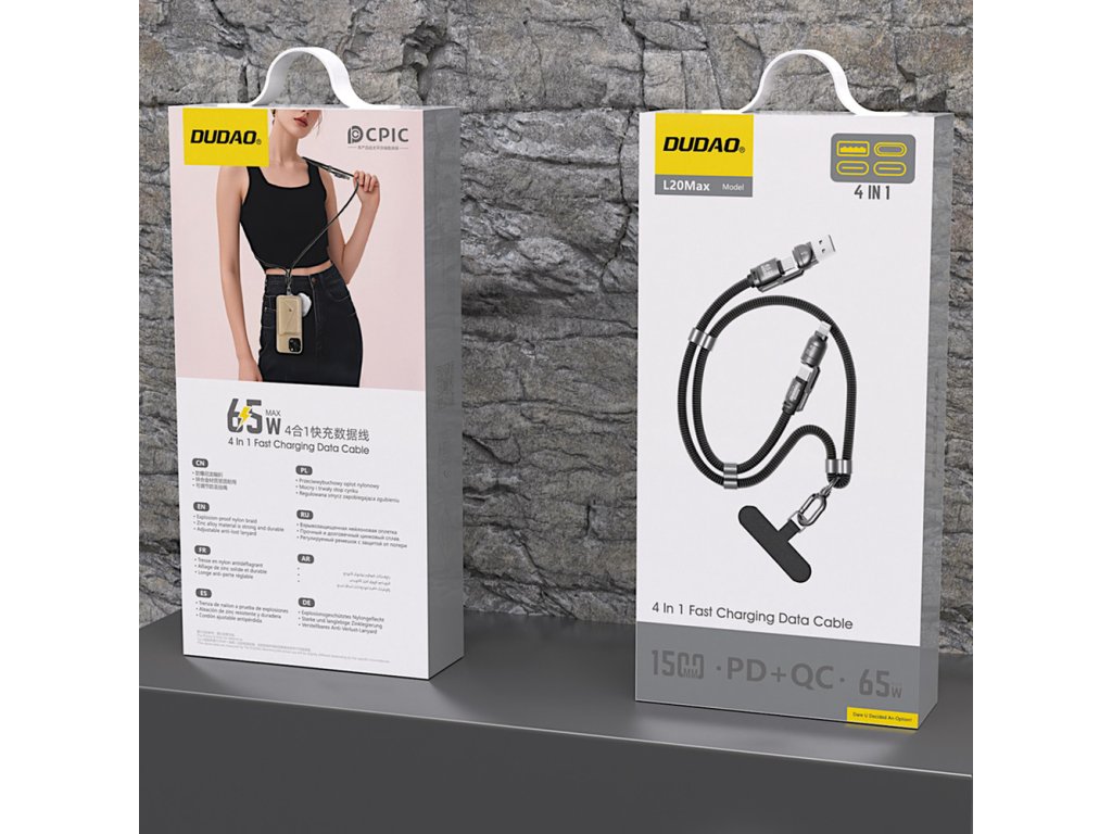 Toto je moderný a všestranný 4v1 kábel Dudao L20MAX, ktorý splní očakávania aj tých najnáročnejších používateľov. Vďaka podpore výkonu až 65 W a podpore technológií Power Delivery a Quick Charge poskytuje bleskurýchle nabíjanie vašich zariadení. Vyrobený z vysoko kvalitnej hliníkovej zliatiny a opleteného nylonu zaručuje odolnosť a odolnosť voči poškodeniu. Možnosť konfigurácie rôznych kombinácií portov (USB-A - USB-C, USB-C - USB-C, USB-C - Lightning, USB-A - Lightning) z neho robí perfektný kábel pre každého. Jeho inovatívny dizajn navyše umožňuje jeho použitie ako šnúrky na telefón, čo poskytuje pohodlie a funkčnosť v jednom.