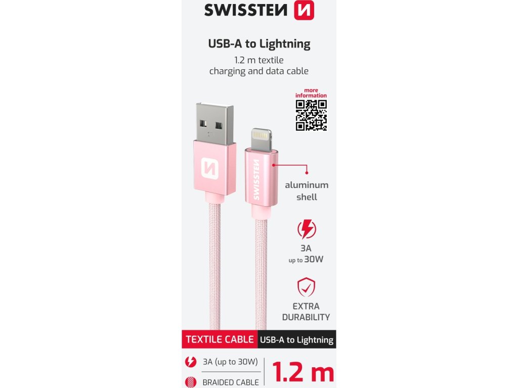 Dátový kábel Swissten USB/Lightning s kvalitným textilným opletením a kovovými krytmi konektorov. Vďaka dĺžke 1,2m je vhodný do auta, na stôl v kancelárii alebo na nočný stolík. Kábel je zosilnený a prenesie tak väčší prúd (až 3A) a zvládne aj rýchly prenos dát 480 Mb/s. Životnosť kábla v ohybe je viac ako 10000 ohybov. Kovový kryt konektora je odolnejší proti mechanickému poškodeniu ako bežné plastové kryty konektorov. Technické parametre: Hrúbka kábla - dva pocínované medené vodiče, kde každý 22 AWG 70/0,01 (to znamená, že každý vodič má 70 prameňov tenkých 0,01 mm, (napr originálny kábel Apple MD818 má 37 prameňov s hrúbkou 0,08 mm) + vonkajší plášť TPE (mäkký plast) - dva pocínované medené dátové pramene, kde každý 28 AWG-12 + vonkajší plášť TPE (mäkký plast) Kryt konektora - materiál: eloxovaný hliník Eloxovanie alebo anodizácia je druh chemicko-tepelnej povrchovej úpravy výrobkov z hliníka (skratka ELektrolytická OXidácia hliníka).Spočíva vo vytvorení ochrannej vrstvy oxidu hliníka na upravovanom povrchu.Táto vrstva už ďalej neoxiduje, a tým pred oxidáciou chráni aj samotný hliník.Používa sa napríklad v leteckej (aj automobilovej) výrobe ale najčastejšie v prípadoch, kde je hliník použitý v exteriéri, napr. pri hliníkových oknách atď. Výhodou je, že po vytvorení tenučkej vrstvy je materiál chránený proti poveternostným vplyvom.