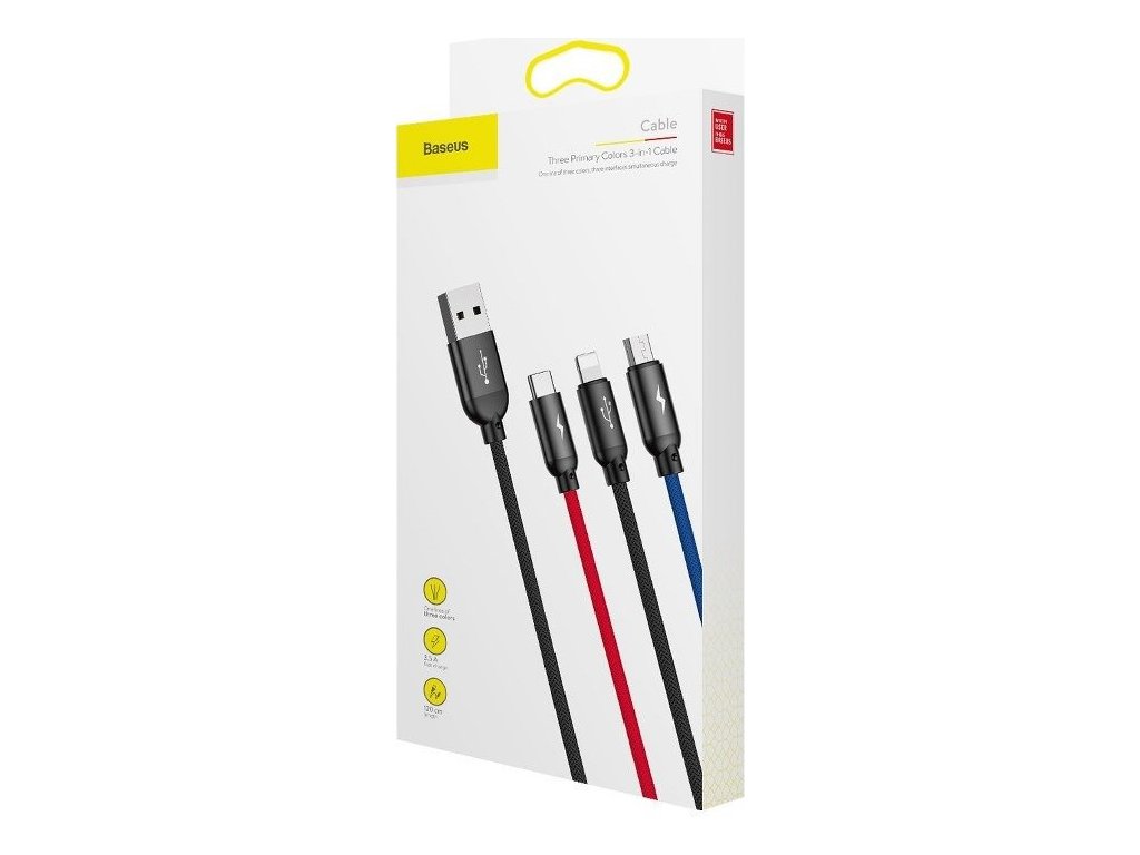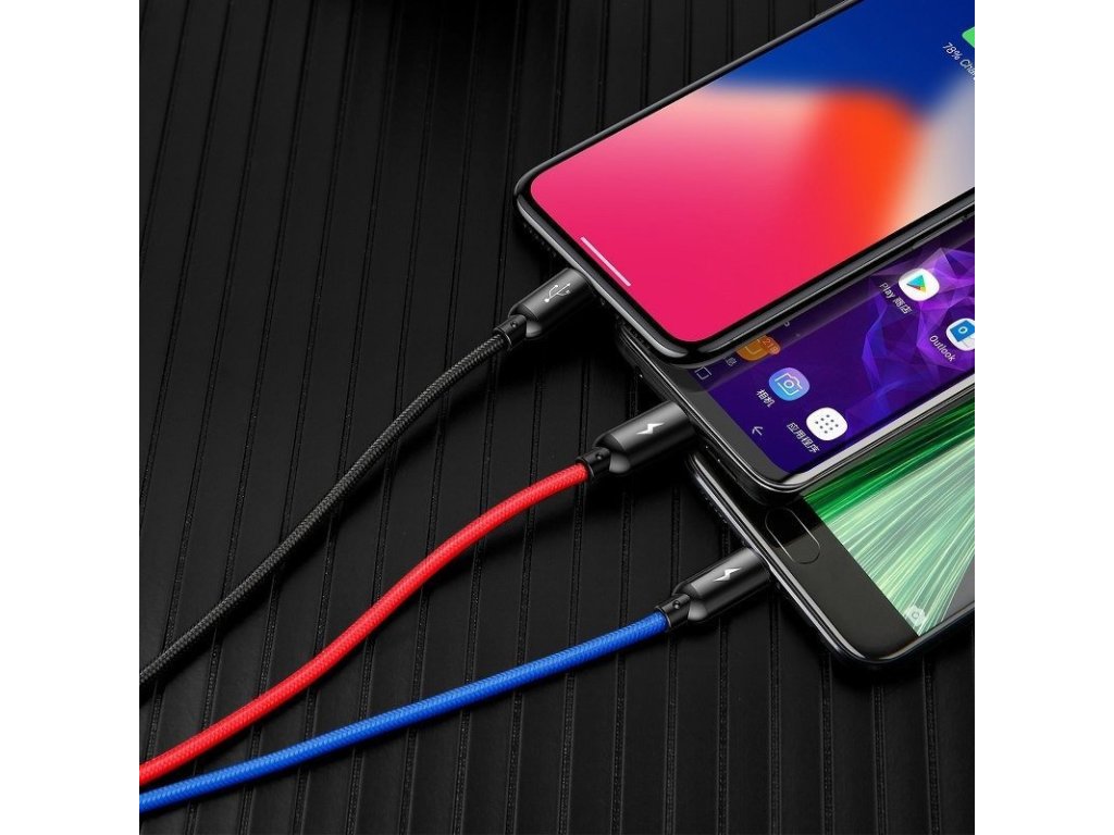 Vysoko kvalitný kábel umožňuje rýchlo a ľahko nabíjať tri zariadenia súčasne – s konektormi USB C, Lightning a Micro USB. Každý kábel má inú farbu, takže ich ľahko rozpoznáte. Kábel podporuje nabíjanie až 3,5 A (max. 2 A na kábel) a je všestranný vďaka svojej širokej kompatibilite. Hliníkové kúsky sú robustné a nylonové opletenie odoláva poškodeniu a oderu a zabraňuje zamotaniu kábla. Priložená viazacia páska uľahčuje skladovanie a organizáciu kábla.
