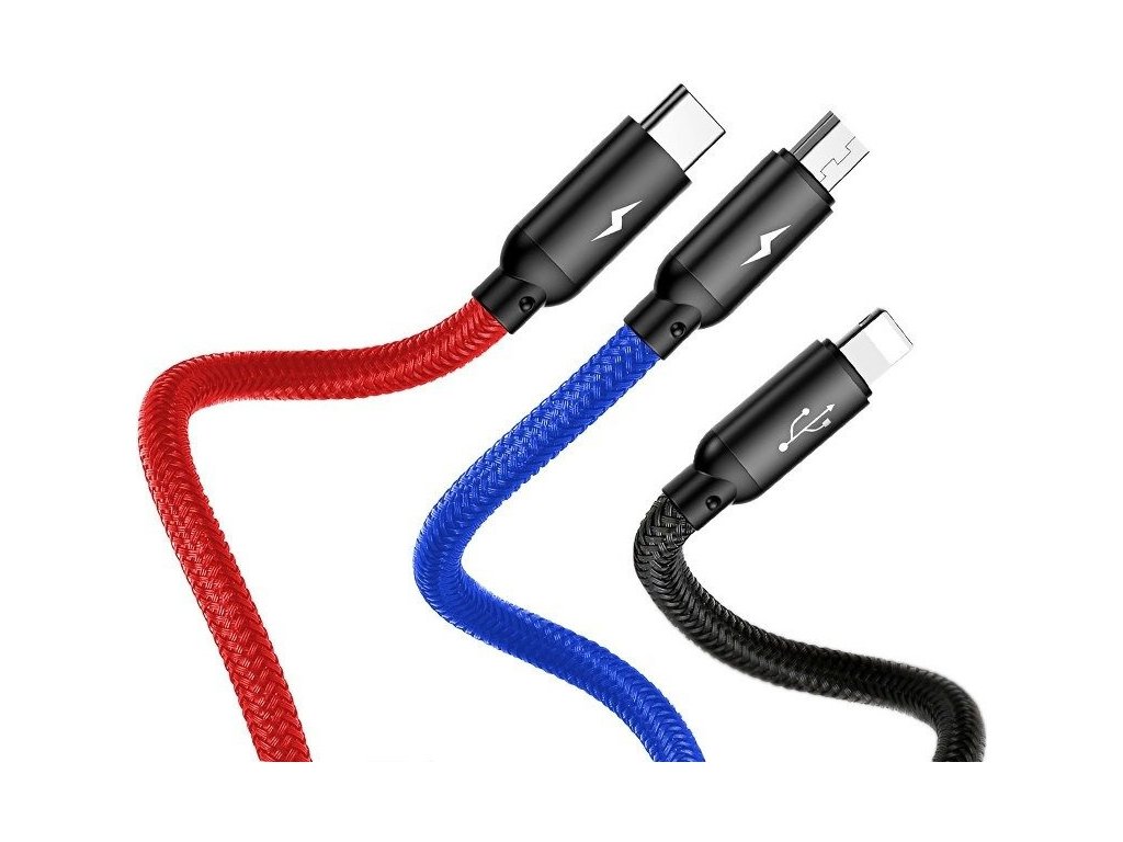 Baseus Free2Draw kábel 3 v 1, USB na micro USB+Lightning+USB-C, 3,5 A, 1,1 m (čierny) Baseus Free2Draw je univerzálny kábel 3 v 1, ktorý je vybavený 3 konektormi – USB-C, micro USB a Lightning.
