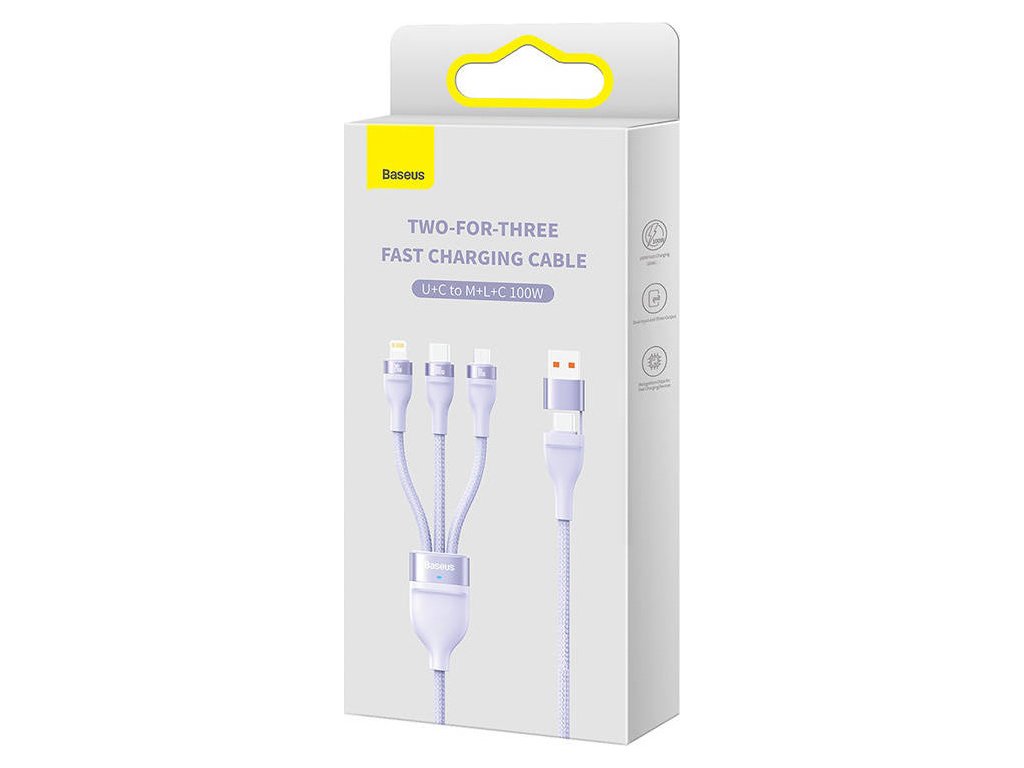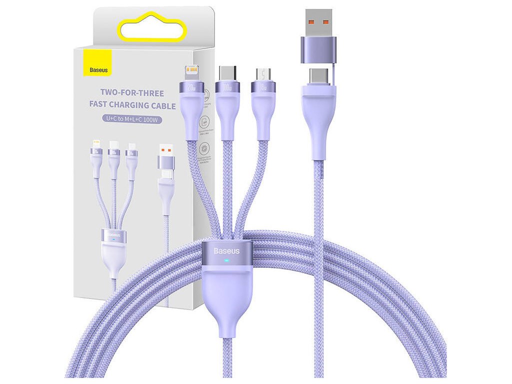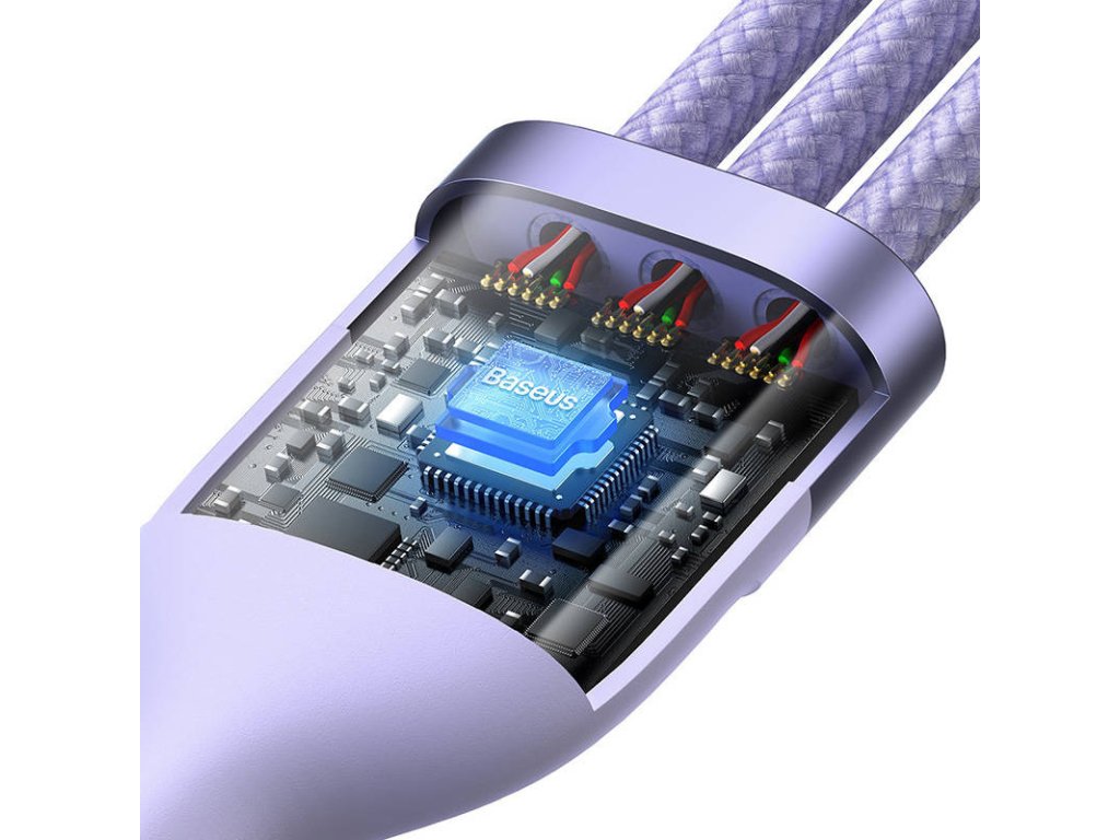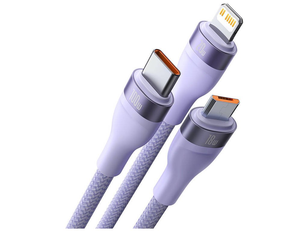 Kábel USB 3v1 Baseus Flash Series 2, USB-C + micro USB + Lightning, 100 W, 1,2 m (fialový)
