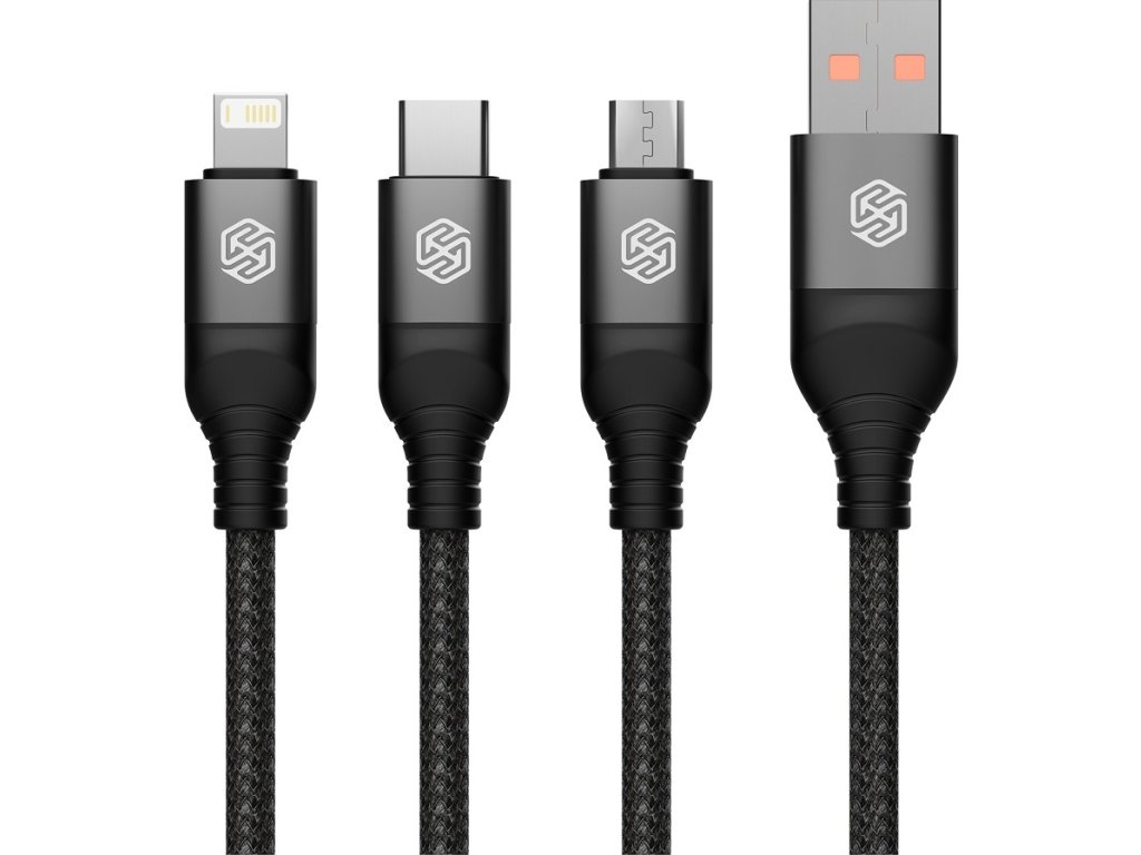 Nillkin Kábel Swift Pro 3v1 pre nabíjanie zariadení USB-C, Lightning a microUSB z USB konektora nabíjačky alebo notebooku, nabíjačky alebo konektora notebooku. Kábel je opletený pre maximálnu pevnosť a dlhú životnosť a nadštandardnú 1.5 m dĺžkou. Je vybavený pevnými koncovkami so zosilnenými koncami pre dlhú životnosť. Špecifikácia - Materiál: Aluminum alloy + Nylon opletenie - Nabíjací prúd 4,4 A - Dĺžka: 1,5 m - Vstup: USB-A