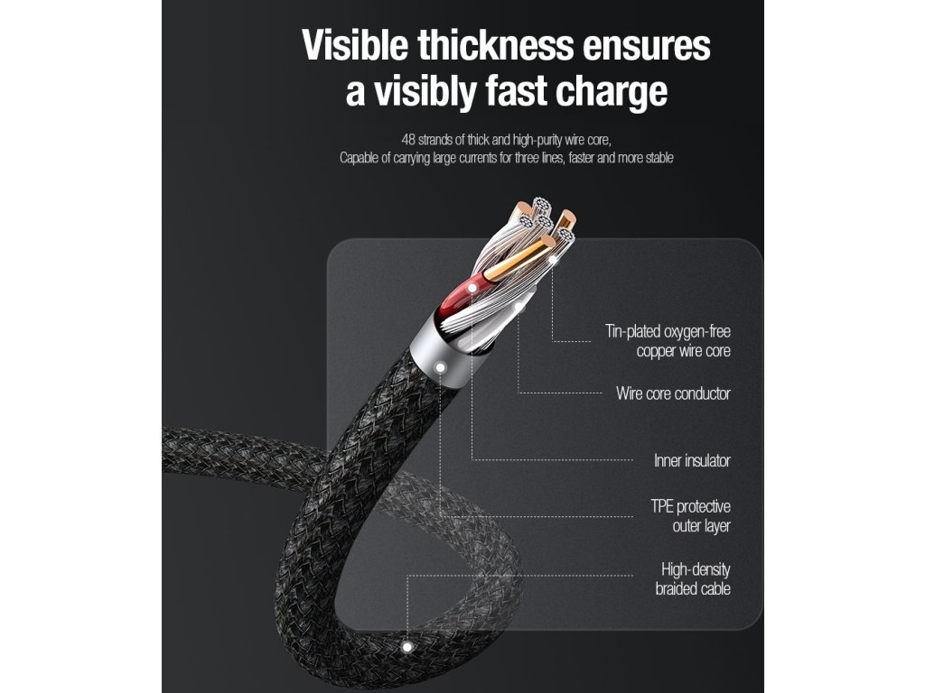 Baseus CAMLTYS-02 kábel pre rýchle nabíjanie 3 v 1 Kábel Baseus CAMLTYS-02 umožňuje rýchle nabíjanie telefónu.