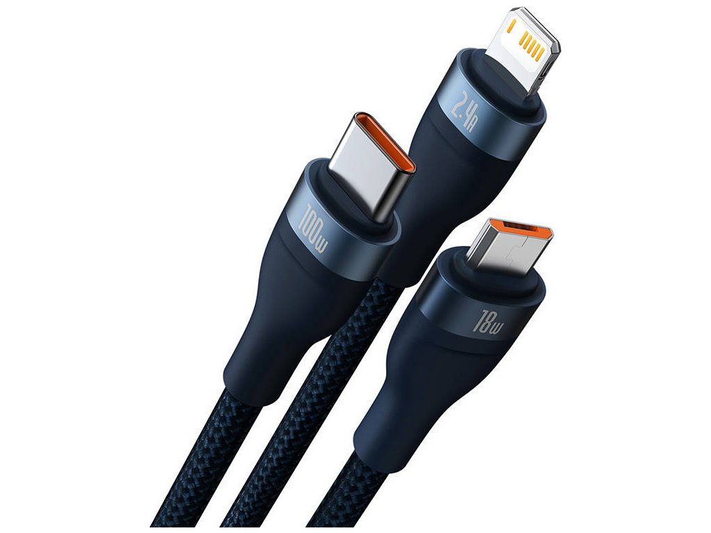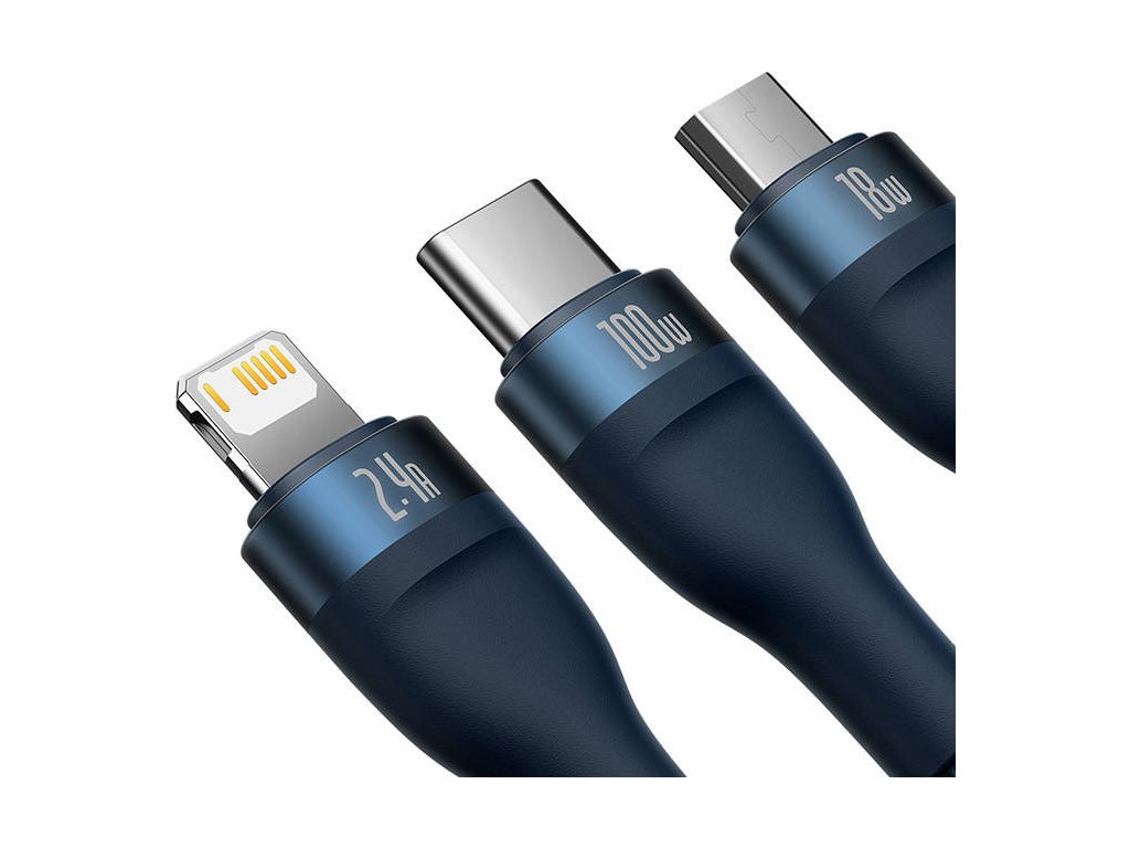 USB kábel 3v1 Baseus Flash Series, USB-C + micro USB + Lightning, 100 W, 1,2 m (modrý)