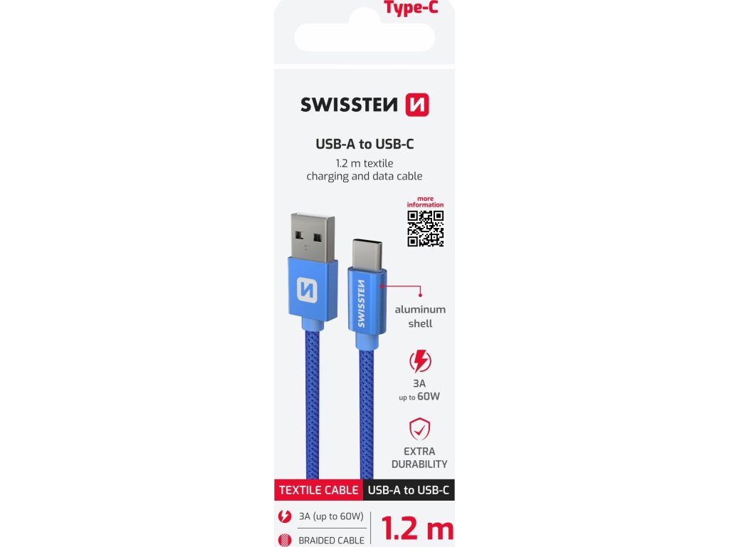 DÁTOVÝ KÁBEL SWISSTEN TEXTILE USB / USB-C 1,2 M MODRÝ