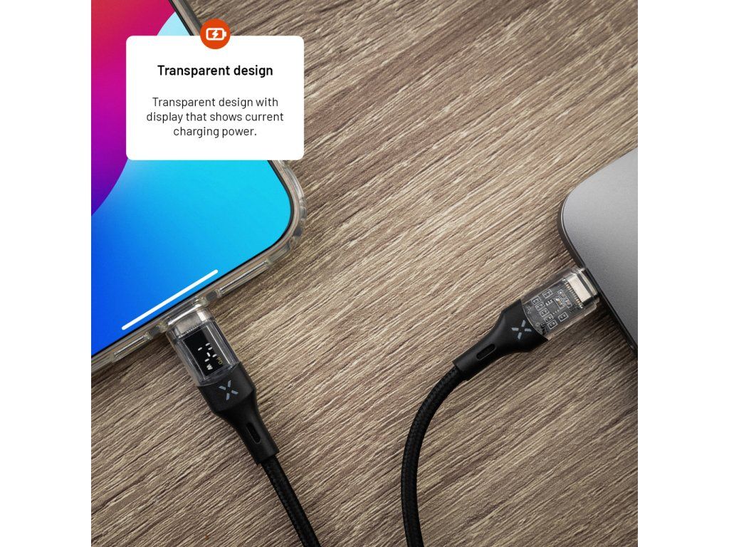 Dátový a nabíjací kábel FIXED s priehľadnými konektormi a digitálnym displejom je unikátne riešeným príslušenstvom. Transparentné koncovky kábla odhaľujú bežne skryté spoje a mikročipy, čo z kábla robí nielen praktický, ale aj dizajnový doplnok. LED displej prehľadne informuje o aktuálnom nabíjacom výkone kábla a zároveň o tom, či je podporovaná technológia rýchleho nabíjania. Na nabíjanie ponúka vysoký výkon až 100 W s podporou Power Delivery 3.0. a zároveň umožňuje aj prenos dát s rýchlosťou 480Mbps v štandarde USB 2.0. Čierny textilný oplet zvyšuje odolnosť kábla. Kábel je v prevedení s konektormi USB-C/USB-C s dĺžkou 2 m.