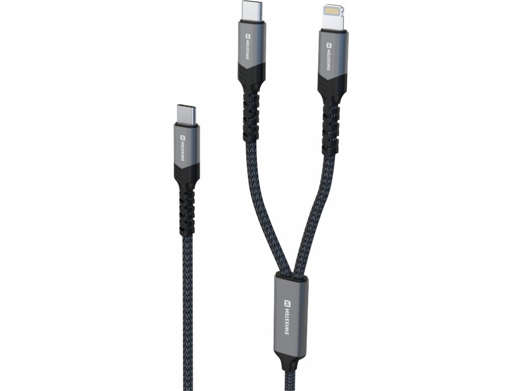 SWISSTEN NABÍJACÍ KÁBEL 2v1 100W USB-C / USB-C + LIGHTNING 1,5 M ČIERNY
