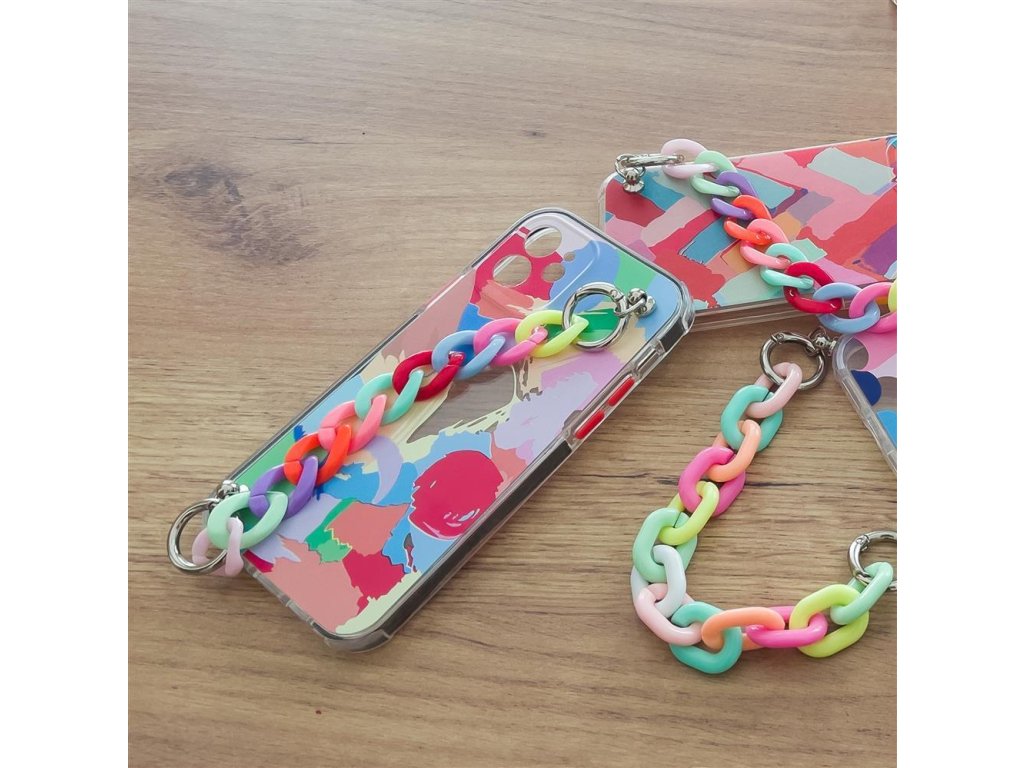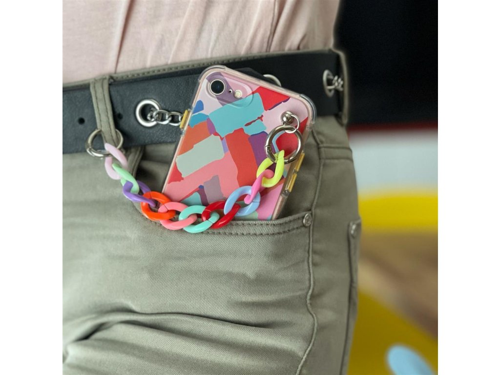 Farebné puzdro na iPhone, ktoré sa vyznačuje zladenou ozdobnou retiazkou. Úlohou tohto pozoruhodného doplnku nie je len originálna dekorácia, ale aj ešte bezpečnejšie uchytenie zariadenia v ruke. Prítomnosť retiazky zabraňuje vypadnutiu smartfónu pri fotení, sledovaní filmov alebo čítaní správ.