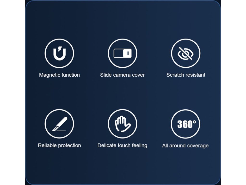 Tenké a elegantné puzdro na telefón, ktoré chráni zariadenie pred poškodením a navyše má posuvný kryt pre zadný fotoaparát. Vďaka krytu je sklo fotoaparátu chránené pred poškriabaním. Ďalšou výhodou je aj pre ľudí, ktorí si cenia súkromie a bezpečnosť svojich údajov. Zakrytá kamera zabraňuje prístupu k nahrávaniu videa, ak niekto získa vzdialený prístup k telefónu a zapne záber z hlavného fotoaparátu.