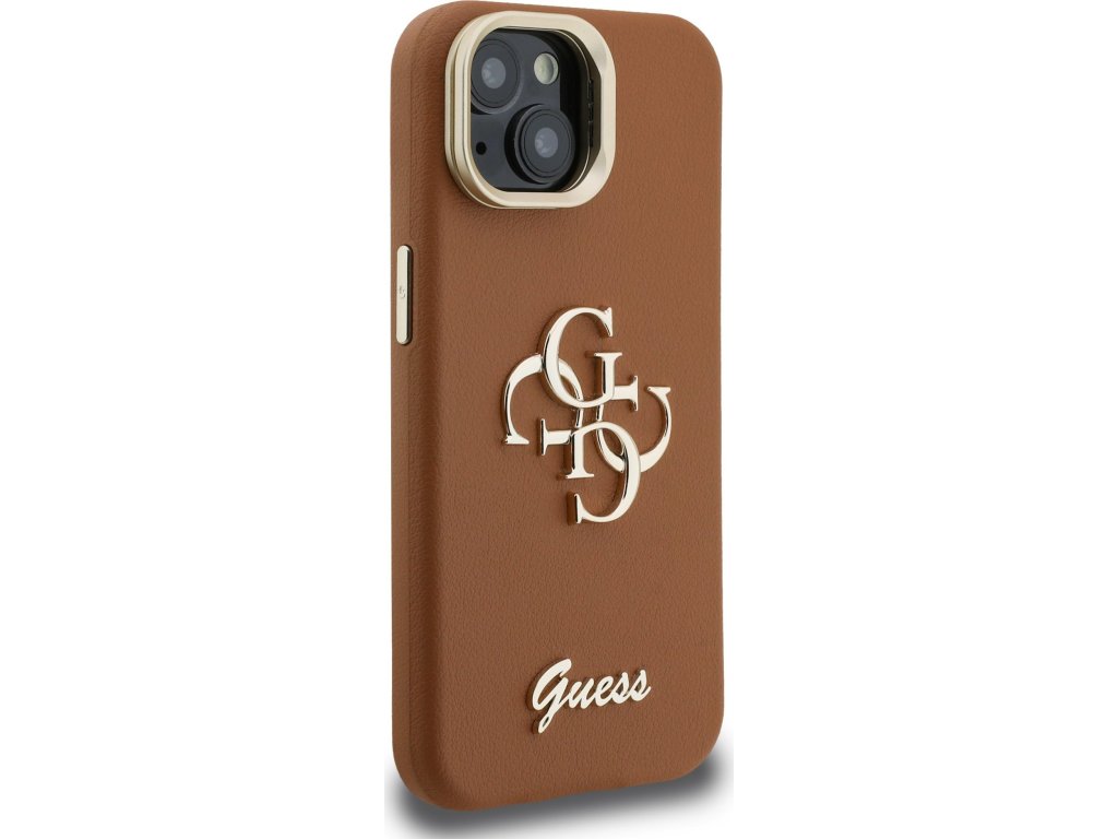 Guess PU Grained 4G Logo Stand Camera Frame Zadný Kryt pre iPhone 14 Brown