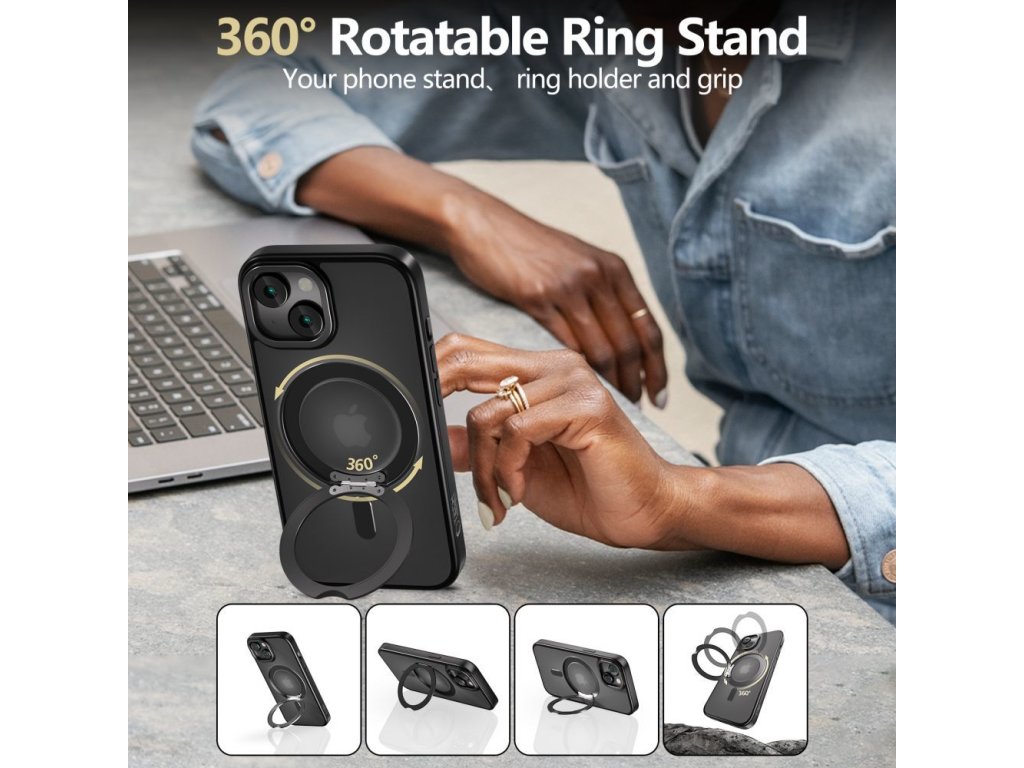 Kľúčovým prvkom puzdra je pohyblivý prsteň, ktorý sa dá otáčať o 360 stupňov, čo umožňuje jeho použitie rôznymi spôsobmi - ako stojan pre pohodlné sledovanie filmov, ako držiak na prst pre bezpečnejšie držanie telefónu a ako prvok podporujúci funkciu MagSafe. Vďaka vlastnostiam MagSafe perfektne spolupracuje s príslušenstvom MagSafe, ako sú nabíjačky alebo magnetické držiaky.