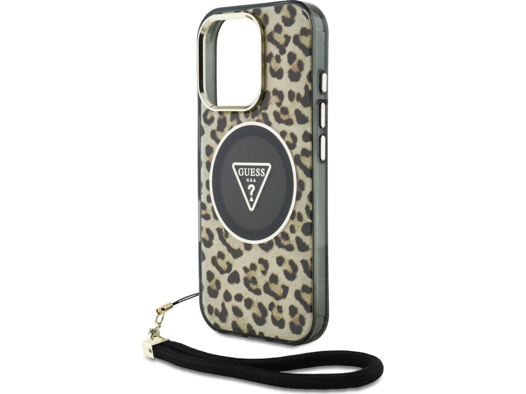 Guess IML Leopard Triangle Logo Strap MagSafe Zadný Kryt pre iPhone 16 Pro Brown