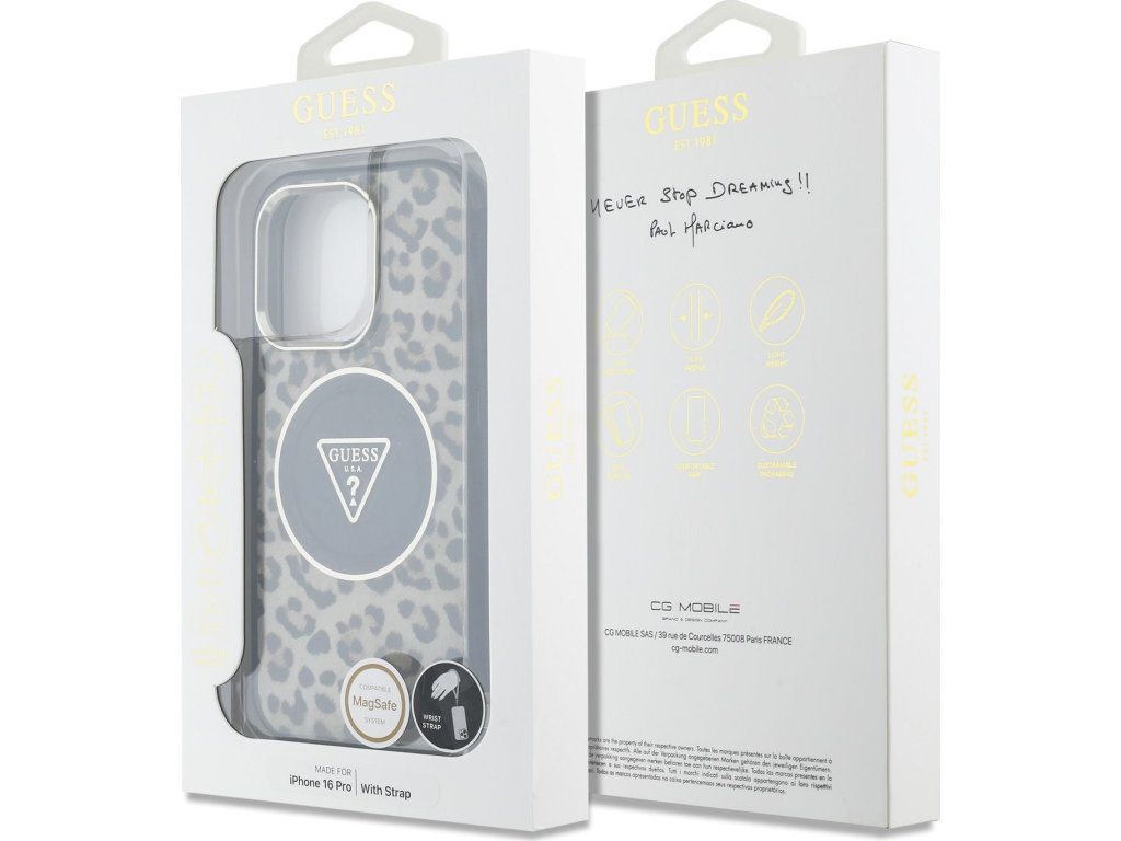 Guess IML Leopard Triangle Logo Strap MagSafe zadný kryt na telefón je skvelým doplnkom pre všetkých milovníkov štýlu a praktickosti. Tento kryt je vyrobený z kombinácie pevného PC plastu na zadnej strane a TPU mäkkého plastu na bokoch, čo vytvára dokonalú symbiózu odolnosti a pohodlia. Vďaka presnému tvaru perfektne sedí na telefóne a umožňuje ľahký prístup ku všetkým tlačidlám a konektorom. Tento kryt podporuje technológiu MagSafe, čo znamená, že je kompatibilný s bezdrôtovým nabíjaním a ďalšími MagSafe doplnkami. Zaujmite výrazným a odvážnym leopardím vzorom, ktorý okamžite priťahuje pozornosť. Kombinácia hnedých a zlatistých tónov s čiernymi škvrnami evokuje divoký a luxusný štýl. Leopardí vzor je dokonale zladený s elegantnými detailmi, ako je čierne trianglo logo Guess. Súčasťou krytu je aj nylonové pútko, ktoré plní nielen estetickú funkciu, ale zaistí aj bezpečné držanie telefónu v ruke. Pokiaľ hľadáte kryt, ktorý kombinuje eleganciu a funkčnosť, je tento kúsok od GUESS tou pravou voľbou pre vás. Kľúčové vlastnosti: - Originál Guess - Pútko okolo zápästia súčasťou krytu - Ľahký a odolný kryt z prémiového PC a TPU - Skvele sa drží v ruke a nekĺže - Podpora MagSafe - Presne kopíruje tvar telefónu a umožňuje ľahký prístup k tlačidlám a konektorom. - Chráni telefón pred prachom a poškriabaním - Štýlový a funkčný doplnok pre váš telefón aj outfit