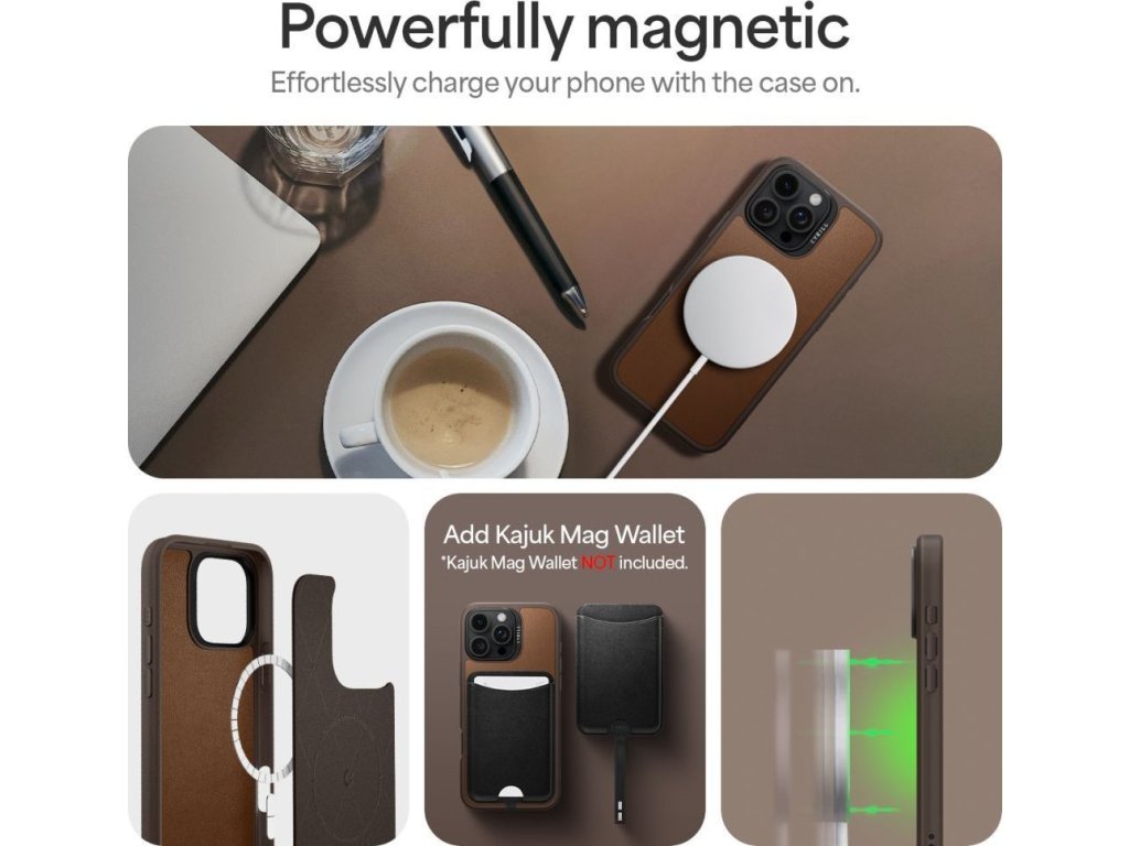 Spigen Cyrill Kajuk MagSafe - classic charm dodáva sa s nastaviteľným čiernym remienkom z umelej kože so zlatými detailmi MagSafe vložený vo vnútri puzdra pre ľahké nabíjanie a pripojenie…