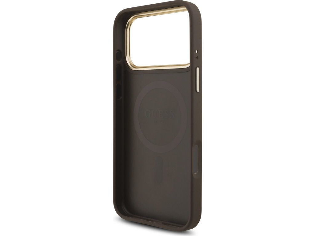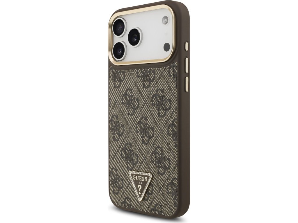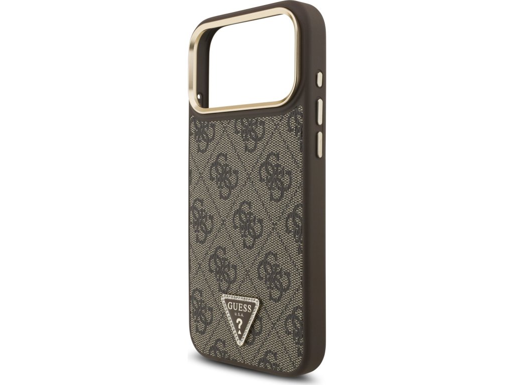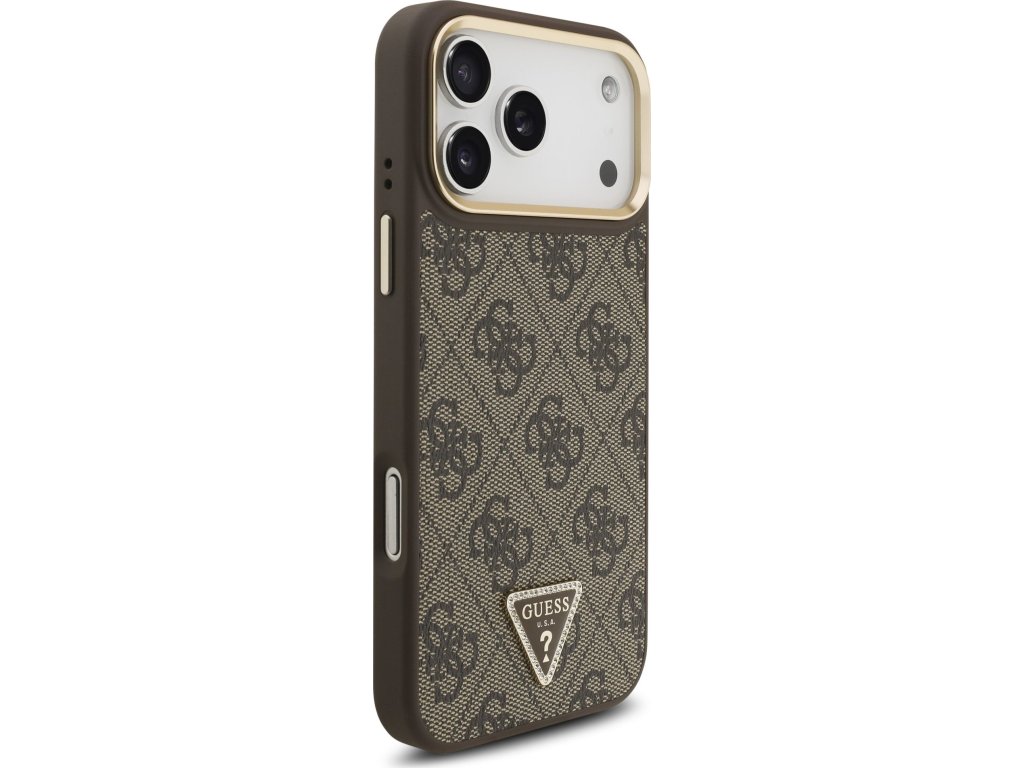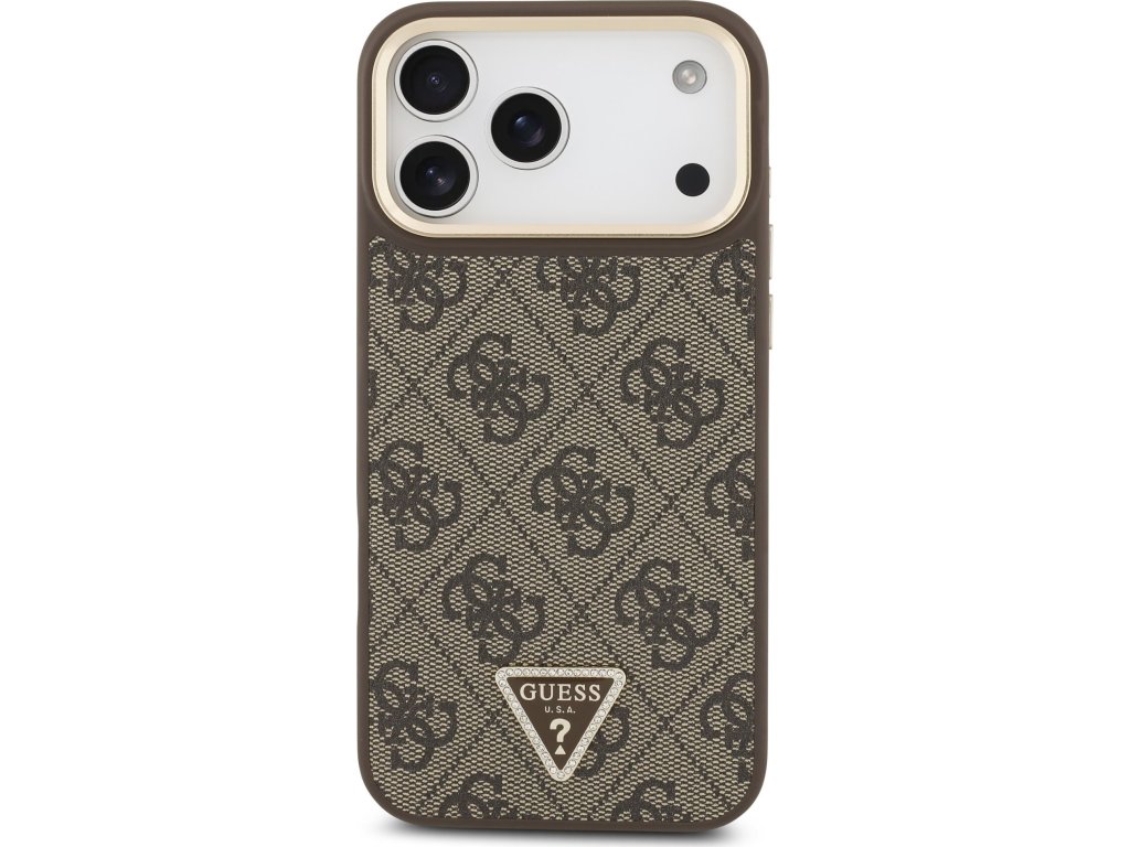 Guess PU Leather 4G Strass Triangle Logo Gold Frame MagSafe Zadný Kryt pre iPhone 17 Pro Max Brown