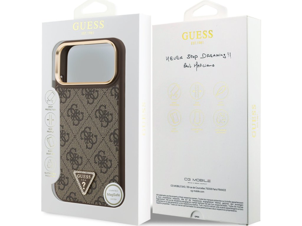 Guess PU Leather 4G Strass Triangle Logo Gold Frame zadný kryt je dokonalý doplnok pre váš telefón aj váš outfit, ktorý kombinuje funkčnosť a štýl v jednom. Je vyrobený z ľahkej a odolnej PU umelej kože a ponúka skvelú ochranu a pohodlie pri používaní. Povrchová úprava krytu zaisťuje, že sa skvele drží v ruke a nešmýka sa, čo minimalizuje riziko vykĺznutia telefónu. Vďaka presnému tvaru perfektne sedí na telefóne a umožňuje ľahký prístup ku všetkým tlačidlám a konektorom. Kryt podporuje technológiu MagSafe, čo znamená, že je kompatibilný s bezdrôtovým nabíjaním a ďalšími MagSafe doplnkami. Guess „4G“ elegantná potlač doplnená o zlaté triangle logo GUESS ponúka nielen luxusný, ale aj nápaditý dizajn. Rámček zadného fotoaparátu je navyše zdobený elegantným zlatým prevedením, ktorý krytu dodáva ešte luxusnejší vzhľad. Pokiaľ teda hľadáte kryt, ktorý kombinuje eleganciu a funkčnosť, je tento kúsok od Guess tou pravou voľbou pre vás. Kľúčové vlastnosti: - Originál Guess - Ľahký a odolný kryt z PU umelej kože - Kovové trojuholníkové logo Guess na zadnej strane - Skvele sa drží v ruke a nekĺže - Podpora MagSafe - Presne kopíruje tvar telefónu a umožňuje ľahký prístup k tlačidlám a konektorom. - Chráni telefón pred prachom a poškriabaním - Elegantný a funkčný doplnok pre váš telefón aj outfit