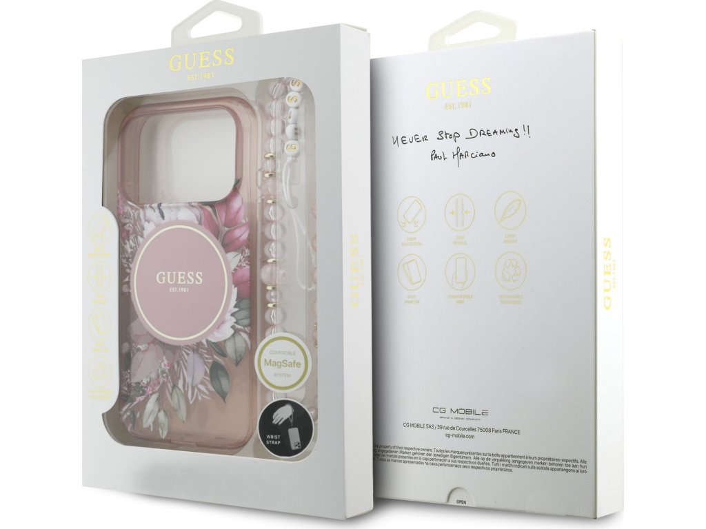 Guess IML Flower Pearl Strap MagSafe zadný kryt na telefón je skvelým doplnkom pre všetkých milovníkov štýlu a praktickosti. Tento kryt je vyrobený z kombinácie pevného PC plastu na zadnej strane a TPU mäkkého plastu na bokoch, čo vytvára dokonalú symbiózu odolnosti a pohodlia. Vďaka presnému tvaru perfektne sedí na telefóne a umožňuje ľahký prístup ku všetkým tlačidlám a konektorom. Tento kryt podporuje technológiu MagSafe, čo znamená, že je kompatibilný s bezdrôtovým nabíjaním a ďalšími MagSafe doplnkami. Dizajn krytu vyniká logom Guess v zlatom kruhu, čo z neho robí nielen praktický, ale aj štýlový doplnok, ktorý skvele doplní váš outfit. Súčasťou krytu je aj korálkové pútko, ktoré plní nielen estetickú funkciu, ale zaistí aj bezpečné držanie telefónu v ruke. Pokiaľ hľadáte kryt, ktorý kombinuje eleganciu a funkčnosť, je tento kúsok od GUESS tou pravou voľbou pre vás. Kľúčové vlastnosti: - Originál Guess - Pútko okolo zápästia súčasťou krytu - Ľahký a odolný kryt z prémiového PC a TPU - Skvele sa drží v ruke a nekĺže - Podpora MagSafe - Presne kopíruje tvar telefónu a umožňuje ľahký prístup k tlačidlám a konektorom. - Chráni telefón pred prachom a poškriabaním - Štýlový a funkčný doplnok pre váš telefón aj outfit