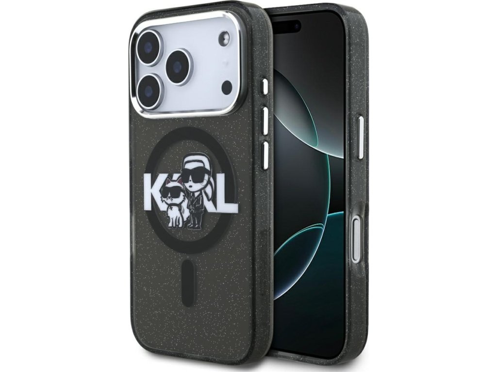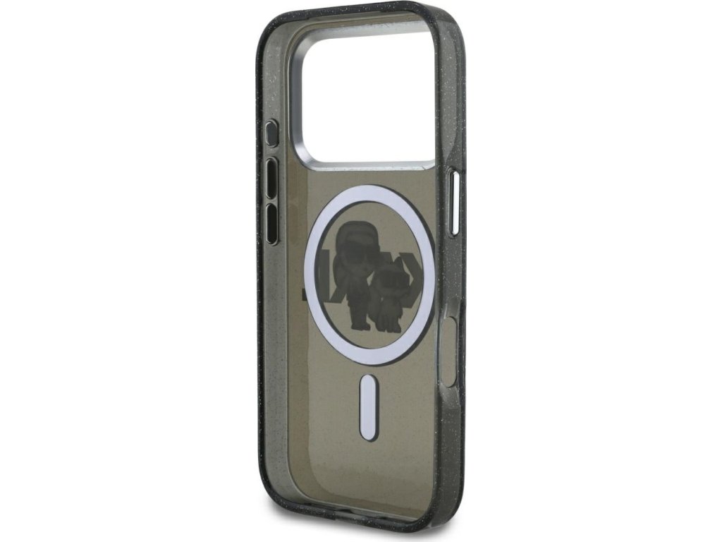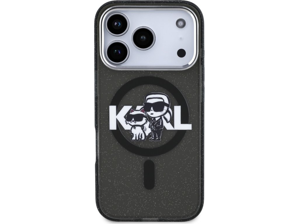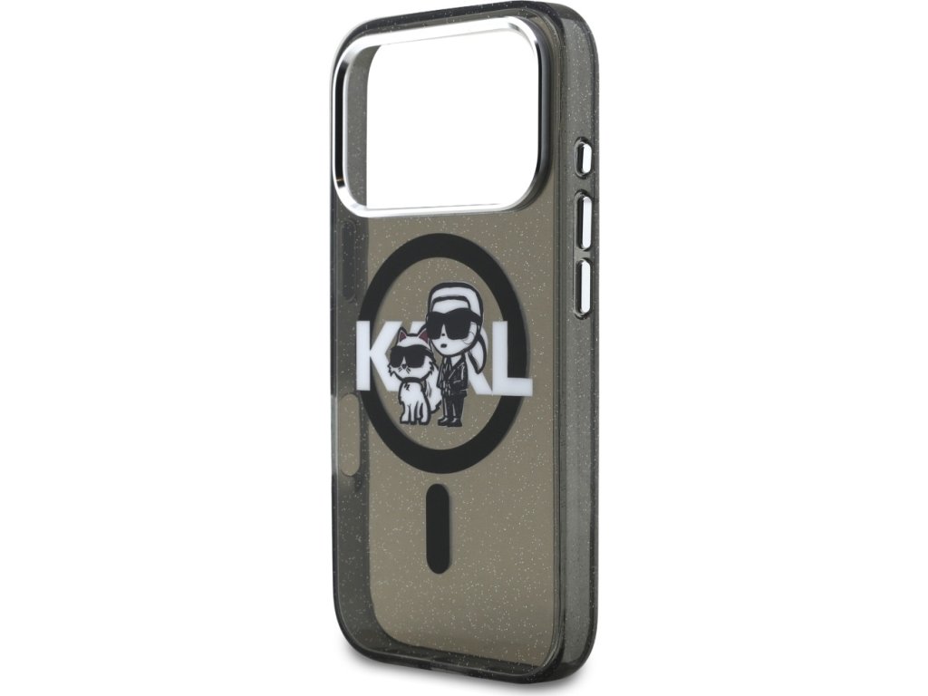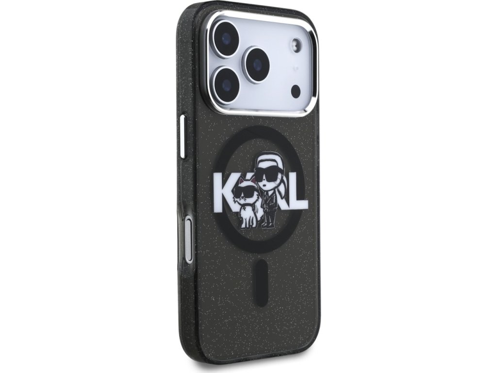 Pouzdro Karl Lagerfeld Magsafe IML s třpytivým designem, kovovým rámečkem a knoflíky pro fotoaparát, logem Karla a Choupette pro iPhone 17 Pro, průhledné