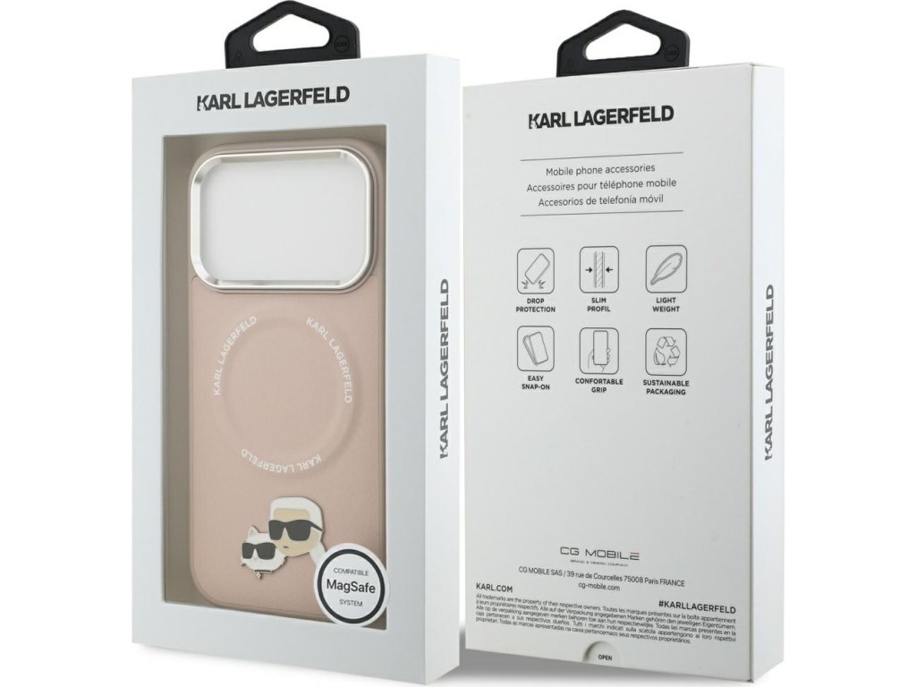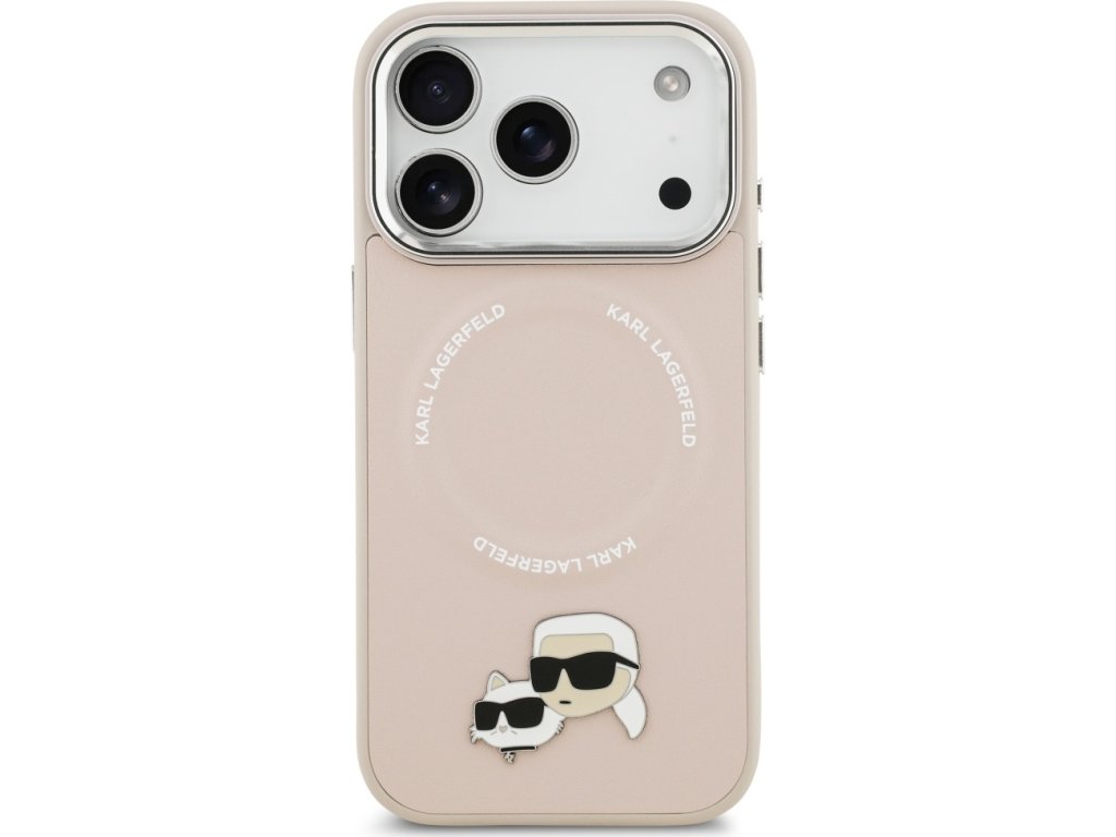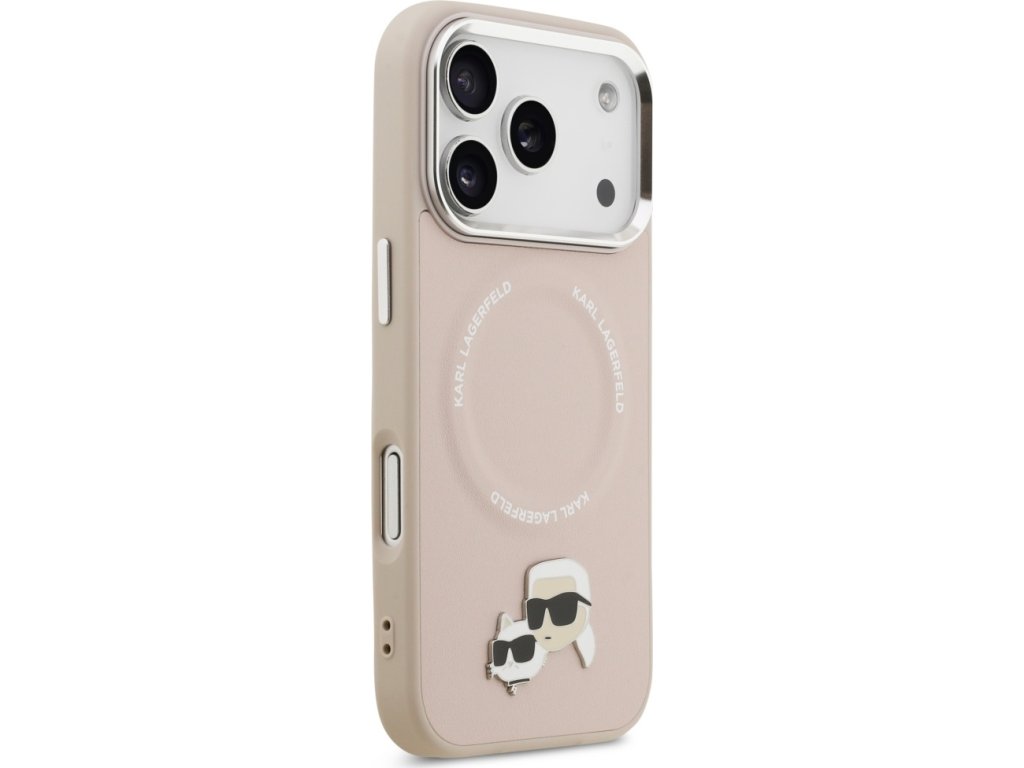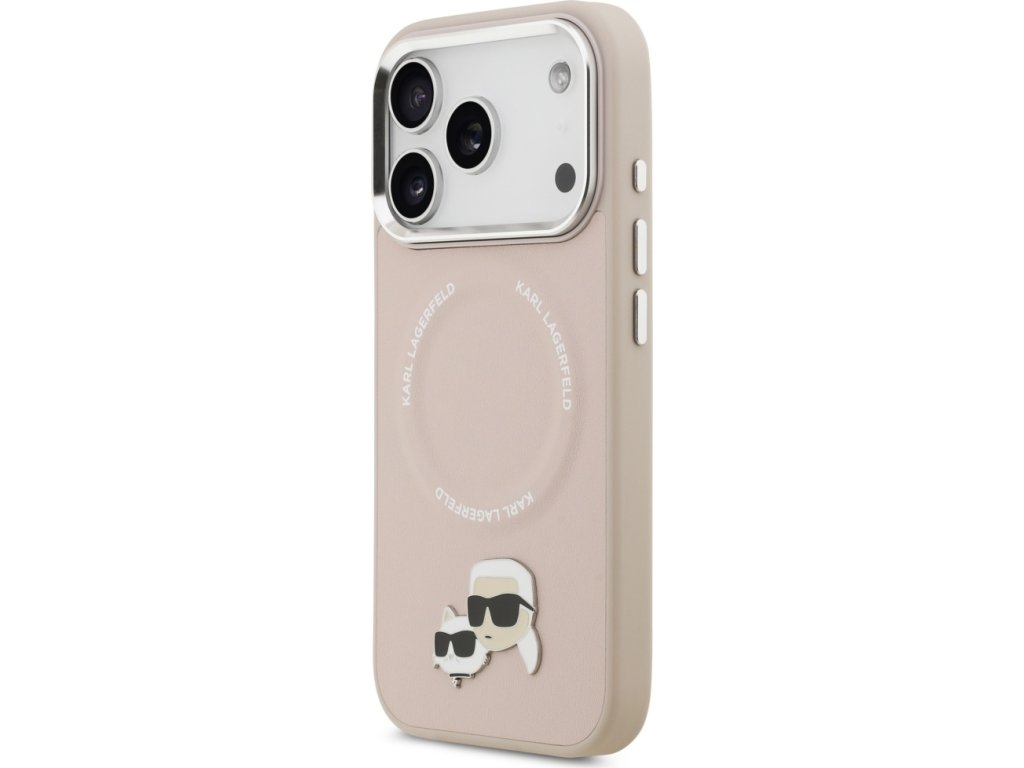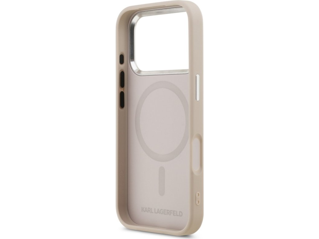 Pouzdro Karl Lagerfeld Magsafe PU s logem Karl&Choupette a kovovými tlačítky fotoaparátu pro iPhone 17 Pro béžové