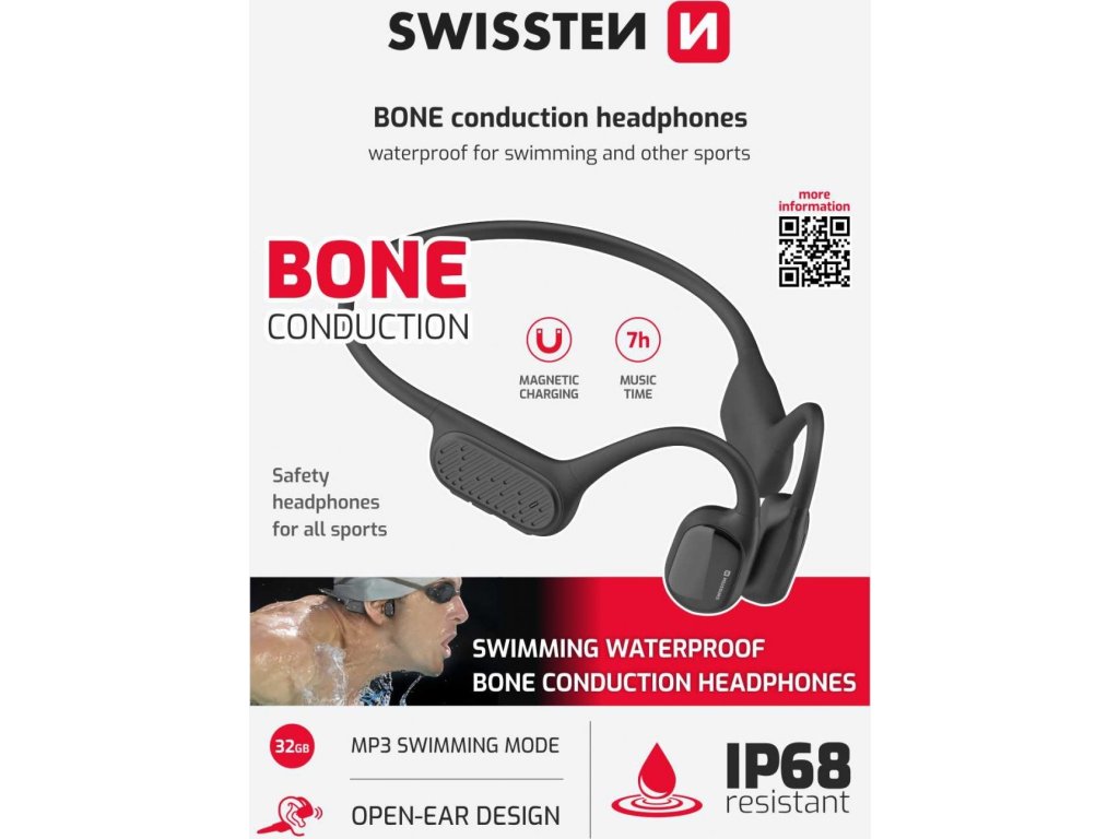 SWISSTEN Bone Conduction, IP68 vodotěsná, Paměť 32 GB, Výdrž hudby: 7 h, Váha: 34 g, Bluetooth 5.3, 2× magnetický kabel, Špunty do uší, Redukce USB-C/USB-A. Baleno v blistru SWISSTEN.