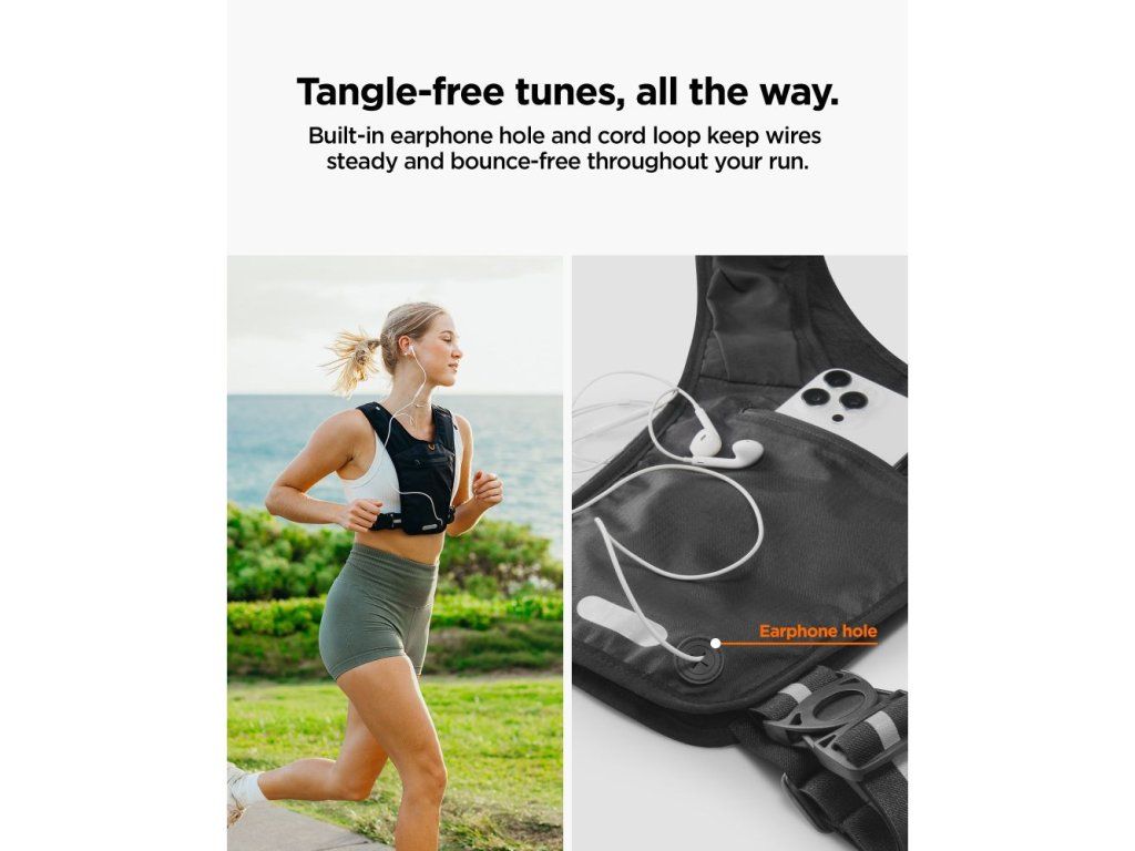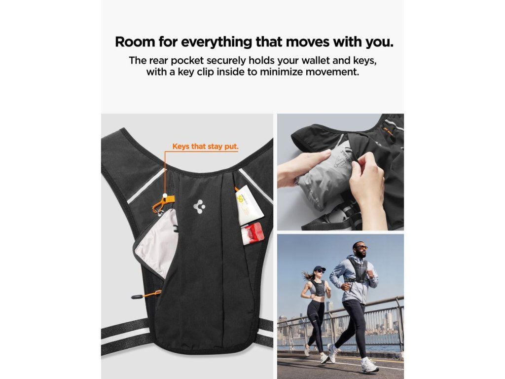 Lehká běžecká vesta Spigen A720 s kapsou pro 6,9" telefon zajistí maximální komfort při běhu. Ideální volba pro bezpečné uložení klíčů a příslušenství bez omezení pohybu.