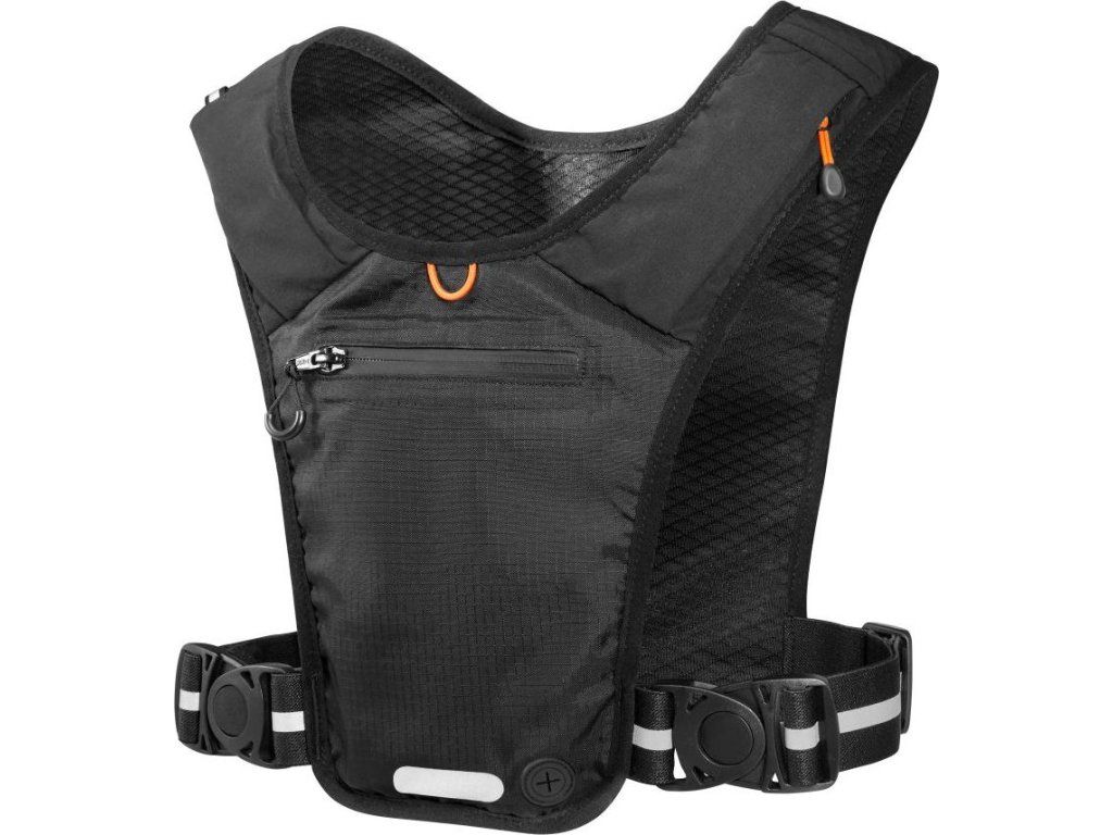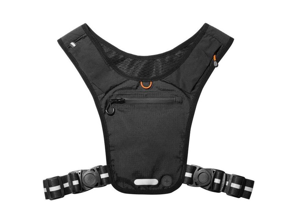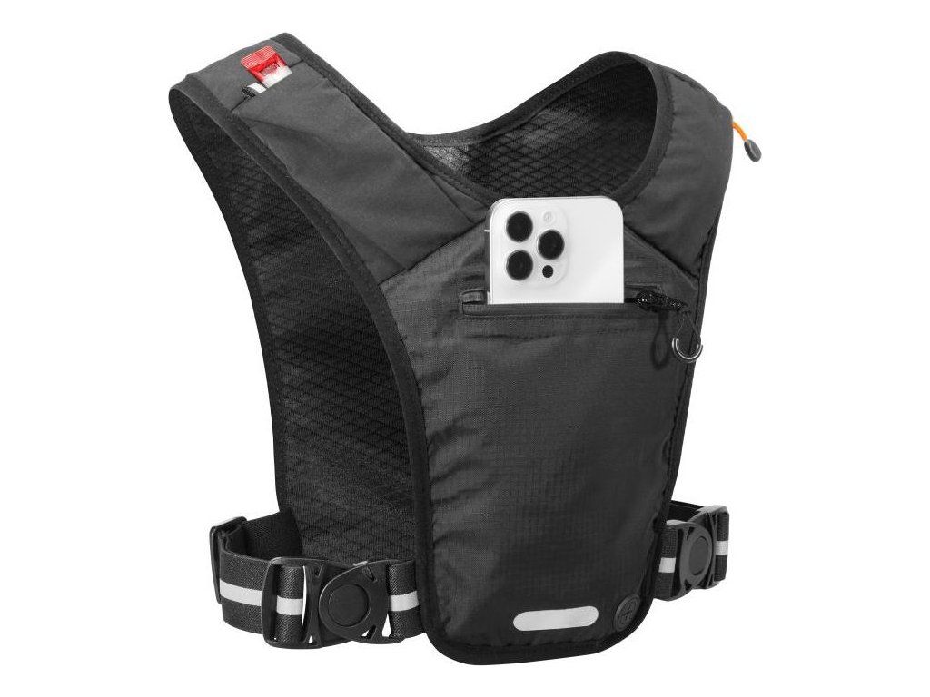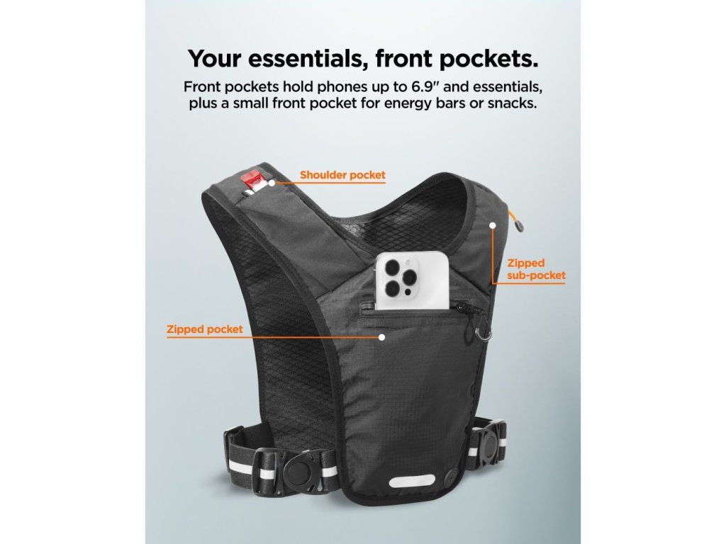 Přední kapsa je navržena pro bezpečné uložení smartphonu, zatímco zadní kapsa s klipem na klíče pojme peněženku i energetické gely. Vše je navrženo tak, aby věci při běhu nepříjemně neposkakovaly. Praktická kapsa na rukávu (paži) pak umožňuje snadný přístup k drobnostem bez nutnosti zastavování.