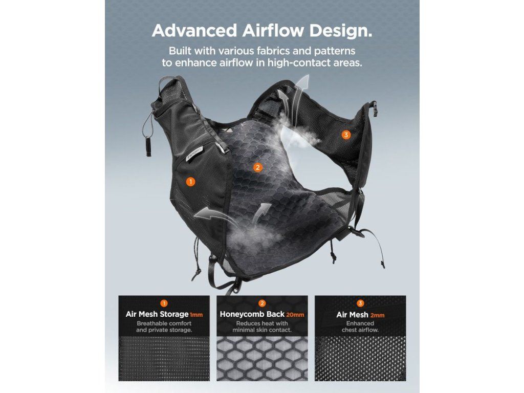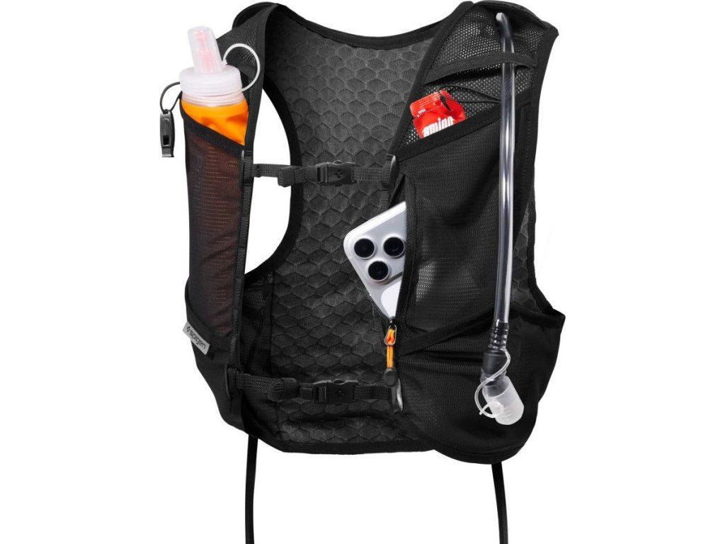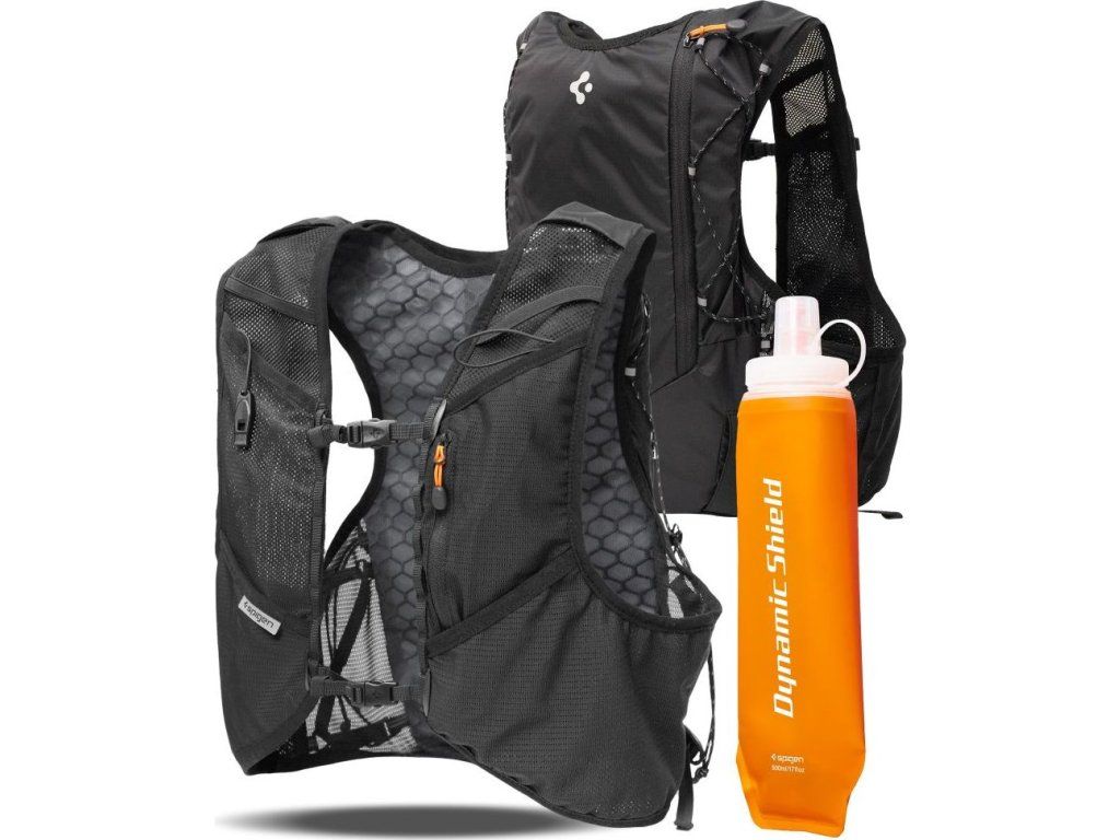 Běžecká vesta Spigen A721 Dynamic Shield s objemem 5 l a 500ml lahví nabízí špičkovou ventilaci a pohodlí. Ideální volba pro maratony i delší tréninky.