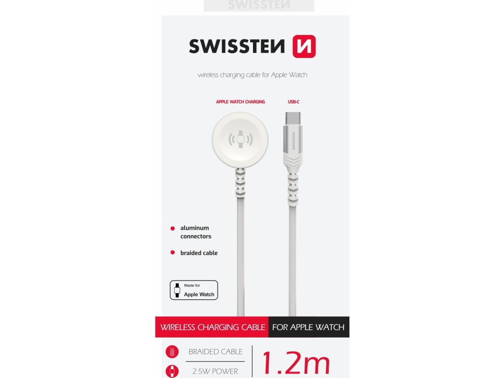 Swissten opletený magnetický kabel pro nabíjení Apple Watch, Kovový dobíjecí puk, Délka: 1.2 metrů, Výkon nabíjení: 2.5 W, Vstupní konektor: USB-C. Baleno v blistru Swissten.