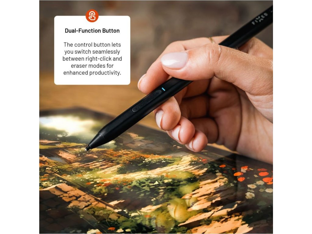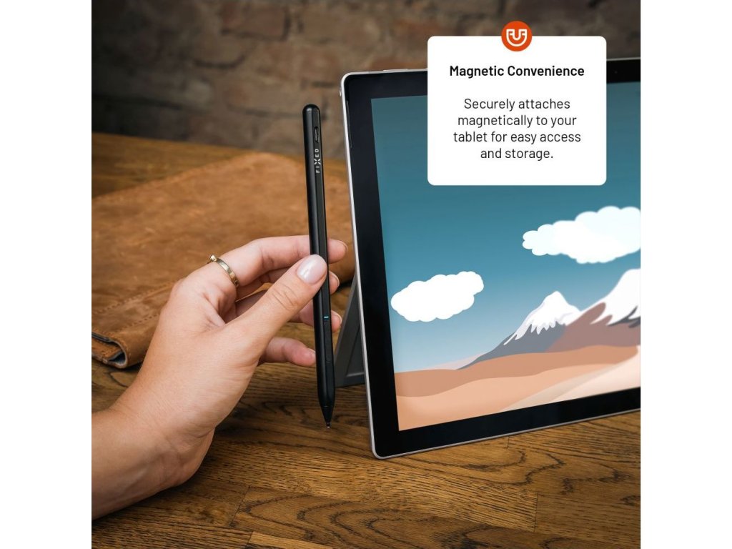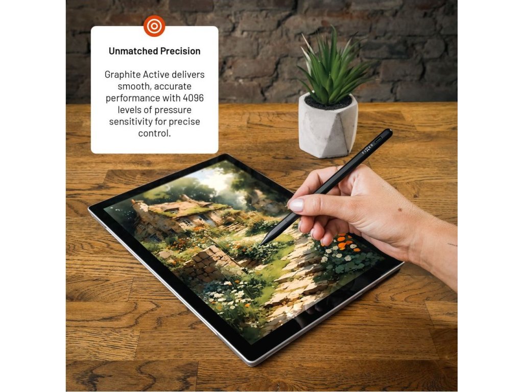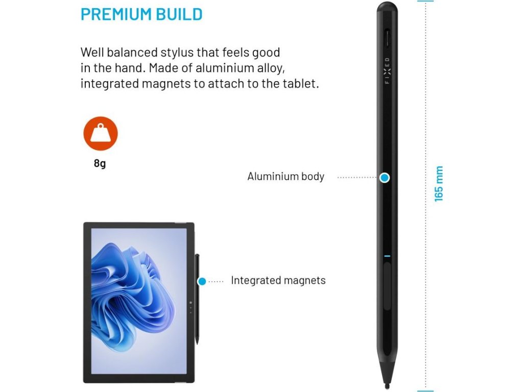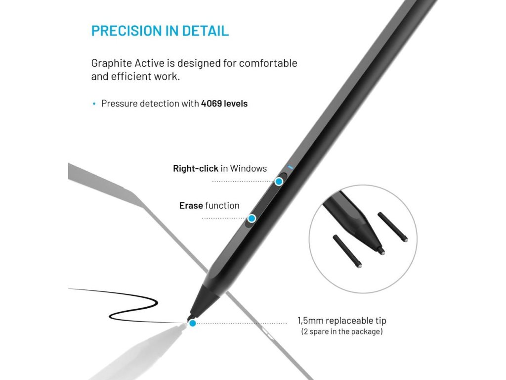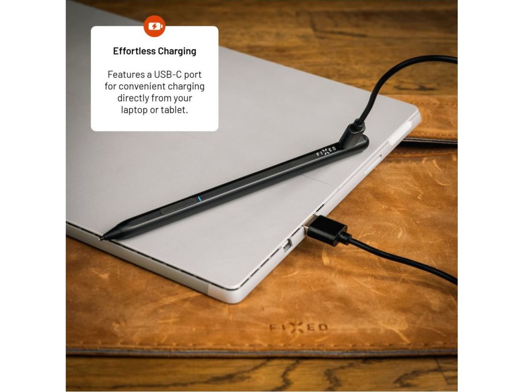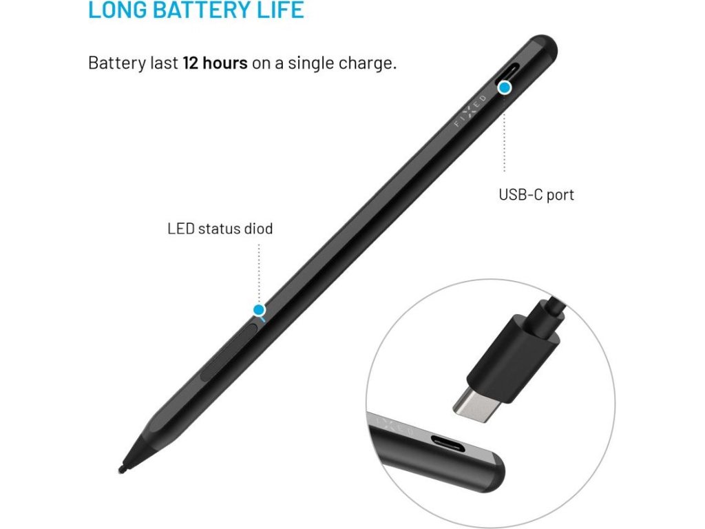 Univerzální stylus FIXED Graphite Active je nezbytným nástrojem pro pohodlnou práci s tabletem nebo notebookem, které podporují standard MPP, zejména Microsoft Surface, ale také zařízení jiných značek. Stylus rozpozná až 4096 úrovní přítlaku pro dokonalou přesnost hrotu při kreslení či psaní na displeji. Pro snadné používání je stylus opatřen dvojitým tlačítkem, jehož horní část simuluje kliknutí pravým tlačítkem myši v prostředí systému Windows a dolní tlačítko aktivuje funkci gumy. Pro ničím nerušenou práci má stylus výdrž až 12 hodin na jedno nabití, poté ho rychle dobijete prostřednictvím USB-C portu. Pro použití není potřeba složitého párování, stylus se sám aktivuje po přiložení hrotu na displej a sám se vypne po 5 minutách nečinnosti. Odolné hliníkové tělo dodává elegantní vzhled a zároveň skrývá magnety pro jeho snadné přichycení k tabletu. Součástí balení jsou dva vyměnitelné hroty.Vlastnosti:
