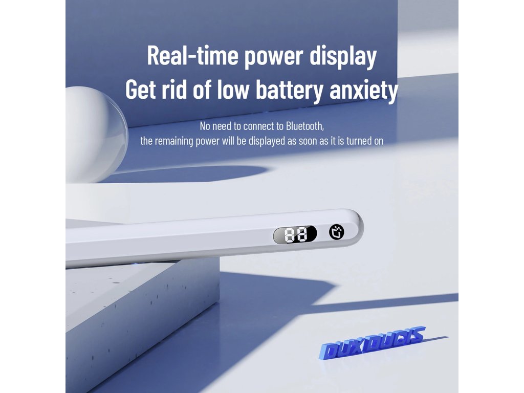Stylus Dux Ducis eliminuje potřebu neustálého připojení Bluetooth nebo párování aplikací. Stačí dlouze stisknout tlačítko a můžete se rychle pustit do práce. Důležité je, že vestavěný displej vás bude informovat o zbývající kapacitě baterie zařízení.