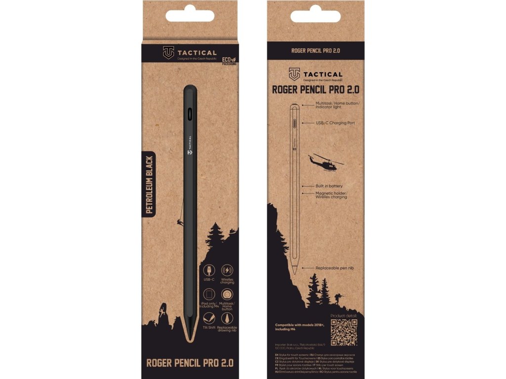 Posaď se do klidu a nacvakni si Tactical Roger Pencil Pro 2.0 na iPad. Ať už jsi umělec, stratég nebo digitální válečník, tahle unikátní tužka na iPad je připravena okamžitě k akci. A to buď v klasické černé nebo křišťálově bílé. Magnetická síla Přicvakni Roger Pencil Pro 2.0 na iPad, jako by byl jeho součástí. Tactical Roger Pencil Pro 2.0 je vybaven magnetickou funkcí, která zajišťuje okamžitou připravenost, když povinnost volá. Bezdrátová munice Dopřej mu šťávu přímo z iPadu nebo z bezdrátové nabíjecí podložky. Jsi příznivcem old-school? Bez obav - nabij přímo ze zásuvky pomocí USB-C portu a kabelu v balení. Rychlé připojení Žádné zdržení se netoleruje. Tactical Roger Pencil Pro 2.0 disponuje rychlou synchronizací a v okamžiku Tě informuje o stavu baterie přímo ve statusovém řádku iPadu. Mistrovství Palm Rejection Tactical Roger Pencil Pro 2.0 se pyšní nejnovější technologií palm rejection. Tvoje dlaň tak může být bez obav opřená o displej, zatímco kreslíš nebo plánuješ strategii. Taktické horní tlačítko Převezmi kontrolu nad svým iPadem. Zapni/vypni tužku podržením tlačítka, vrať se na domovskou obrazovku iPadu nebo aktivuj multitasking. Vestavěné LED světlo v tlačítku Tě informuje o stavu baterie nebo nabíjení. Základ z mědi Tactical Roger Pencil Pro 2.0 v sobě skrývá sílu v podobě kostry vyrobené z vysoko kvalitní vodivé mědi, která určuje přesnost Tvým příkazům. NEODOLATELNĚ ODOLNÝ Tento kousek není jen pro parádu. U nás v Tactical dbáme na to, aby věci něco vydržely. Tactical Roger Pencil Pro 2.0 byl podroben tvrdým podmínkám a při výrobě jsme použili velice odolné materiály a aplikovali nejnovější technologie pro co nejlepší výstup. BE ECO My v Tactical máme rádi přírodu. Všechny naše produkty jsou balené do ECO krabiček z recyklovaného papíru tak, aby co nejméně zatěžovaly životní prostředí. Mysli takticky!